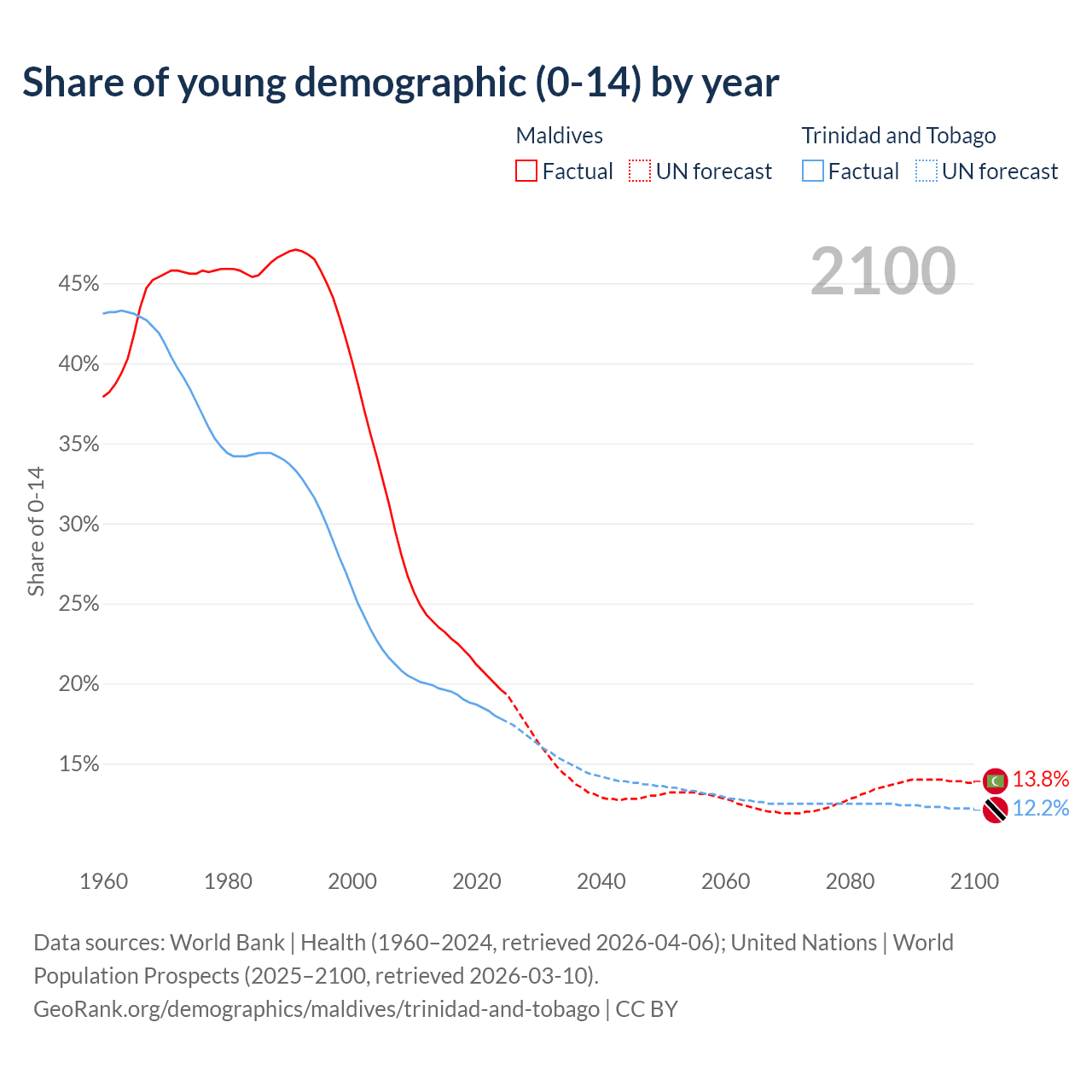 - The share of young demographic (0-15 years old) in Maldives is 19.6% vs 17.8% in Trinidad and Tobago.