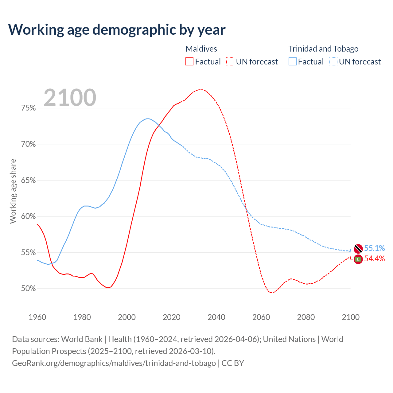 Median age Maldives vs Trinidad and Tobago, 1960-2100