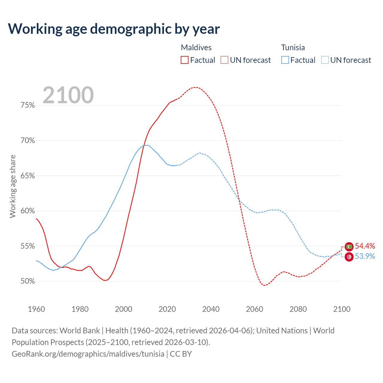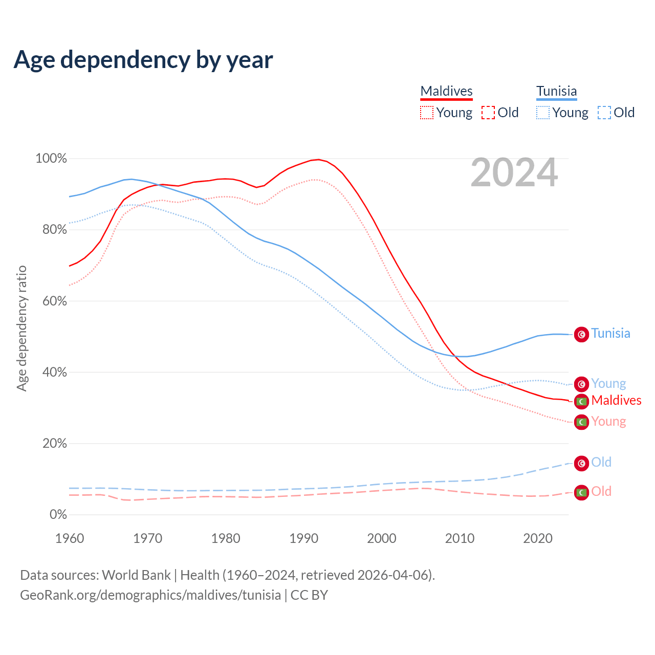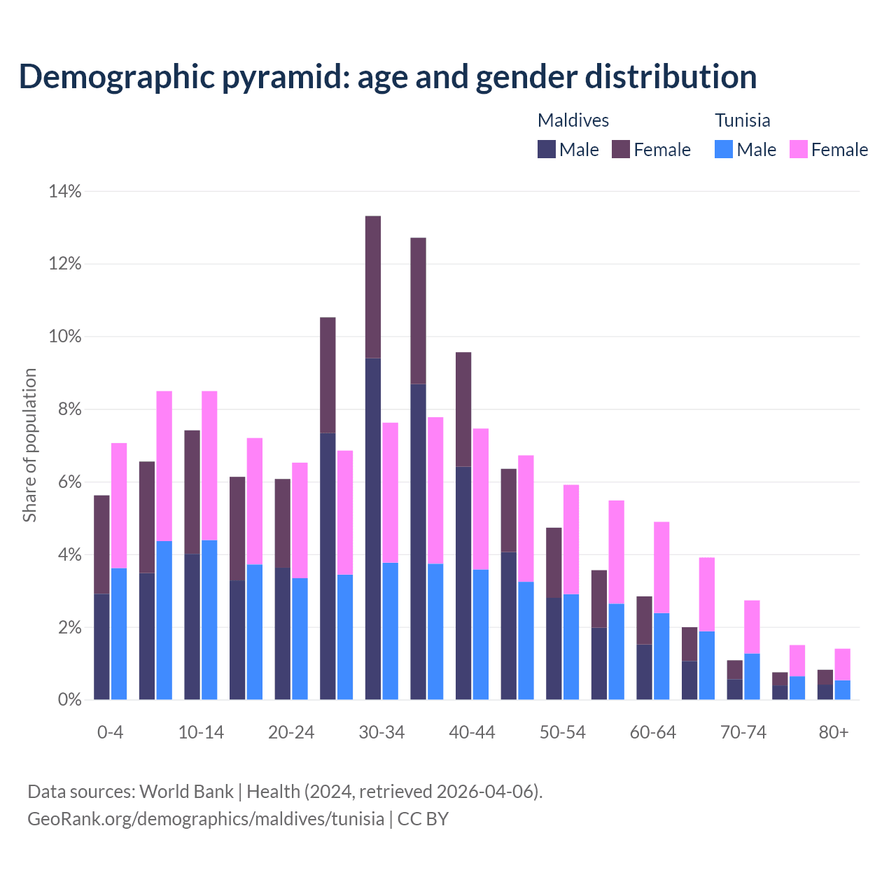 - Maldives is ranked 90/196 by median age (oldest to youngest) vs 86/196 for Tunisia.