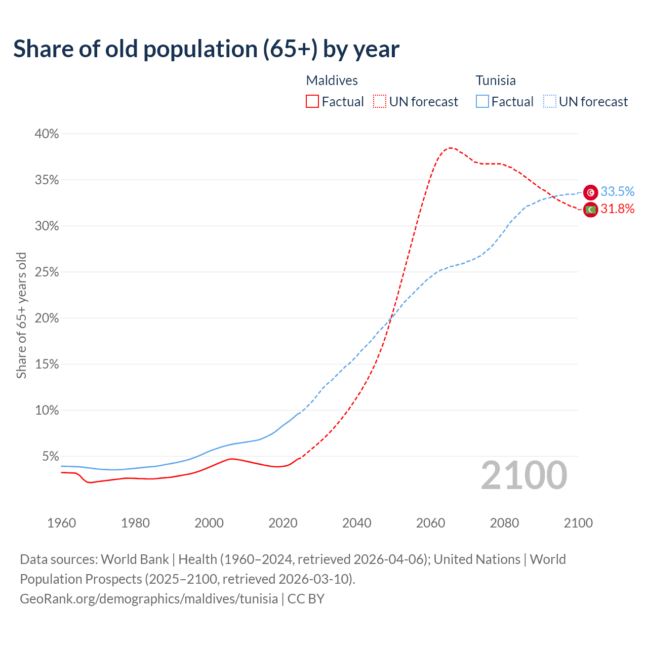 - The share of old-age demographic (65+) in Maldives is 4.64% vs 9.53% in Tunisia.