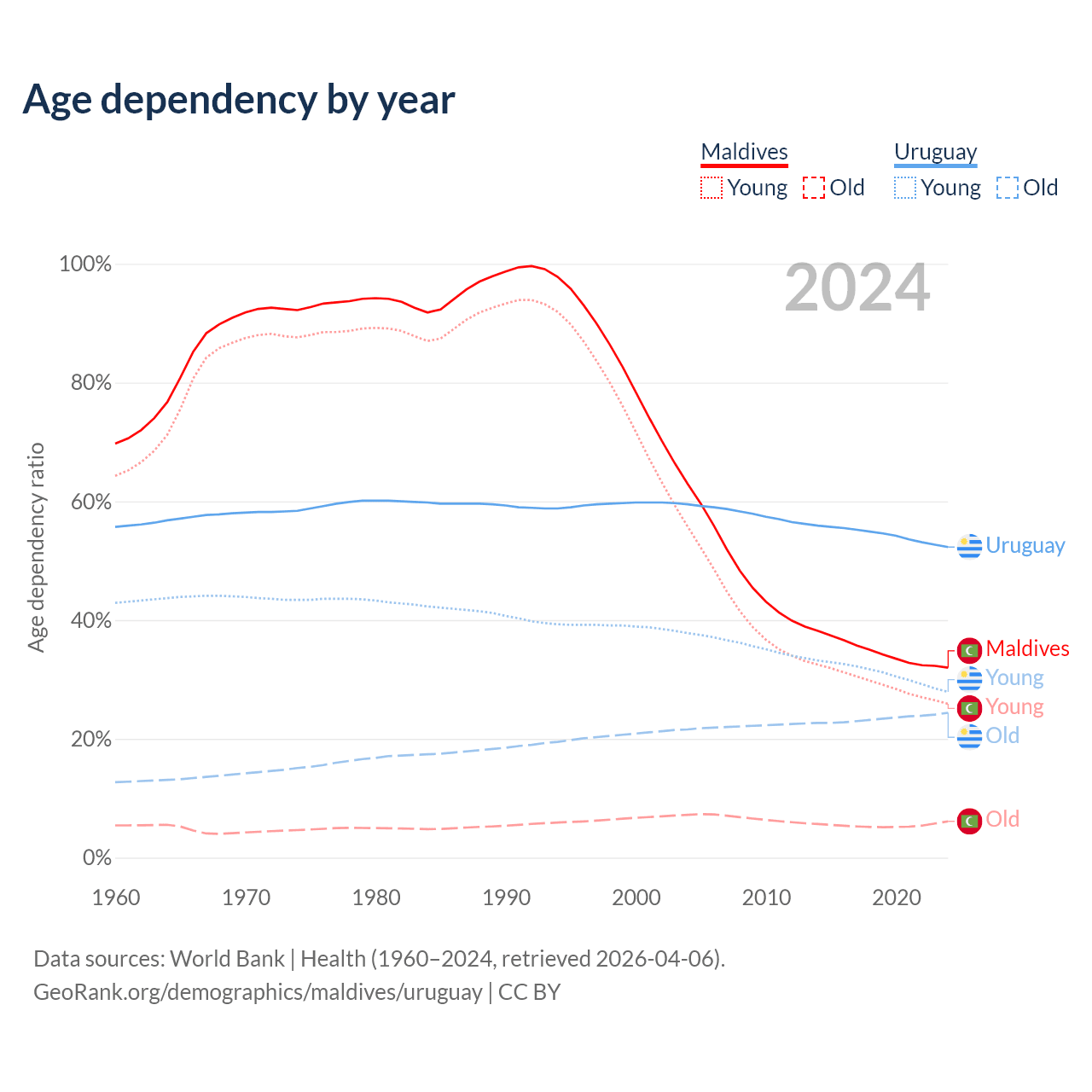 Data sources: World Bank | Health (1960–2024, retrieved 2026-04-06); U.S. Census Bureau (1960–2024, retrieved 2026-02-08).