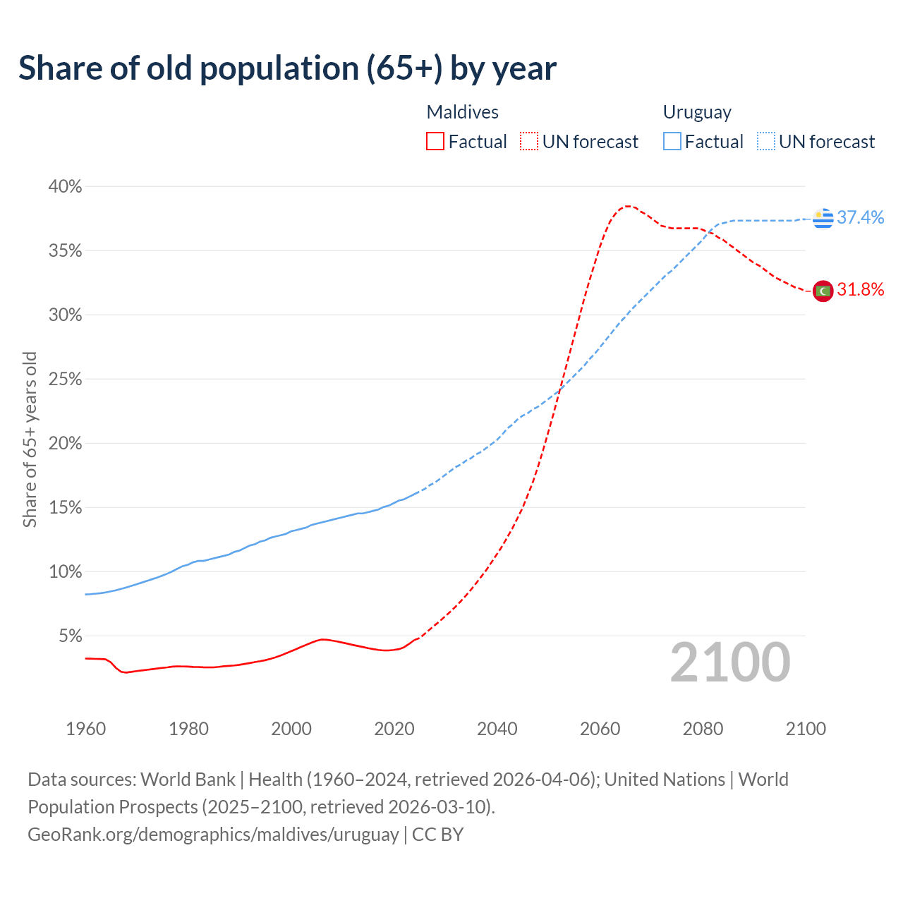 The share of older people aged 65 and over is 4.64% in Maldives and 16% in Uruguay. Life expectancy in Maldives compared to Uruguay .