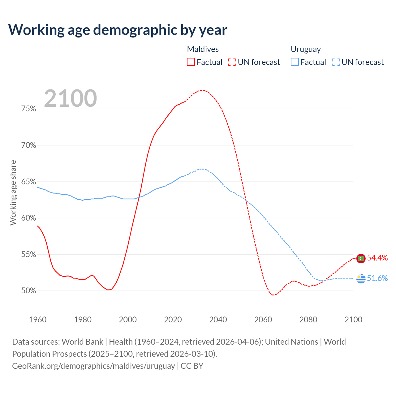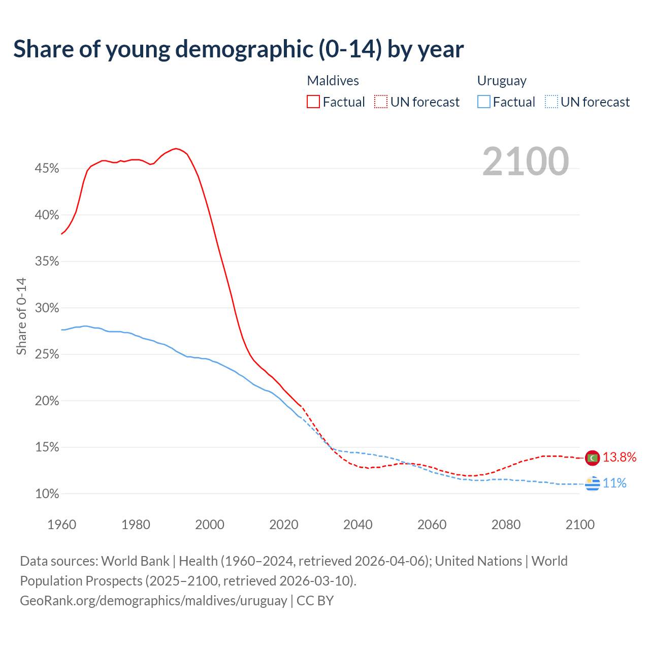 - The share of young demographic (0-15 years old) in Maldives is 19.6% vs 18.3% in Uruguay.