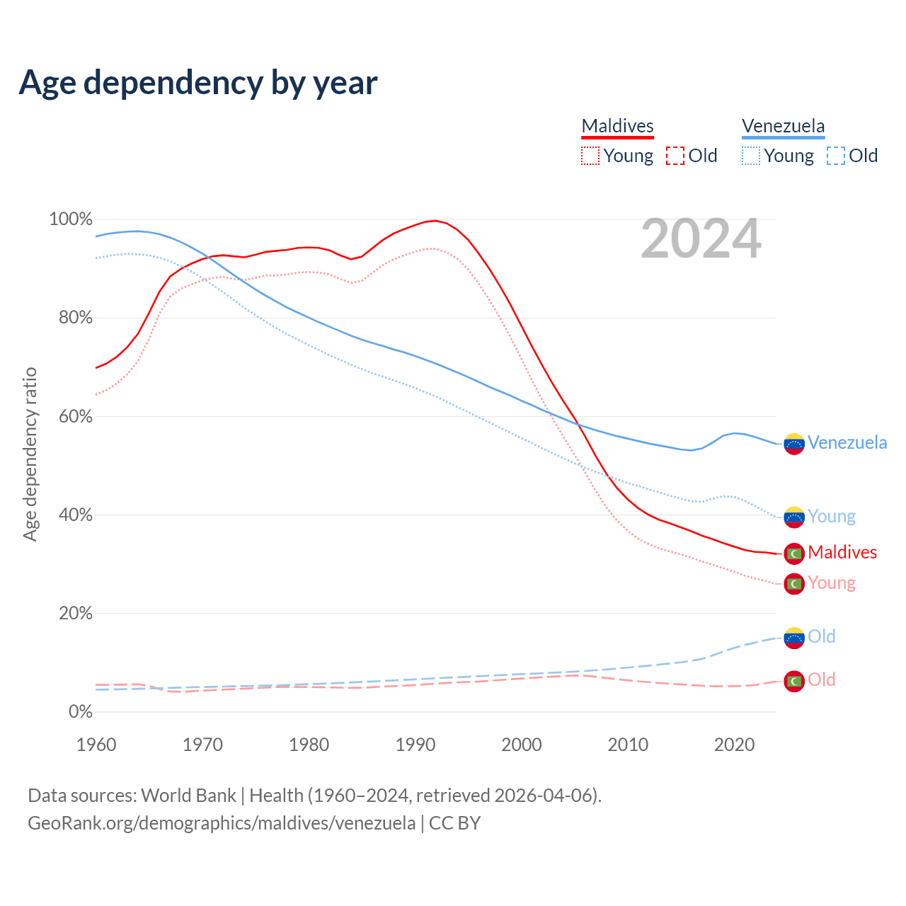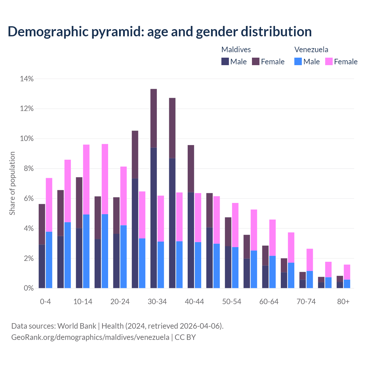 - Maldives is ranked 90/196 by median age (oldest to youngest) vs 104/196 for Venezuela.