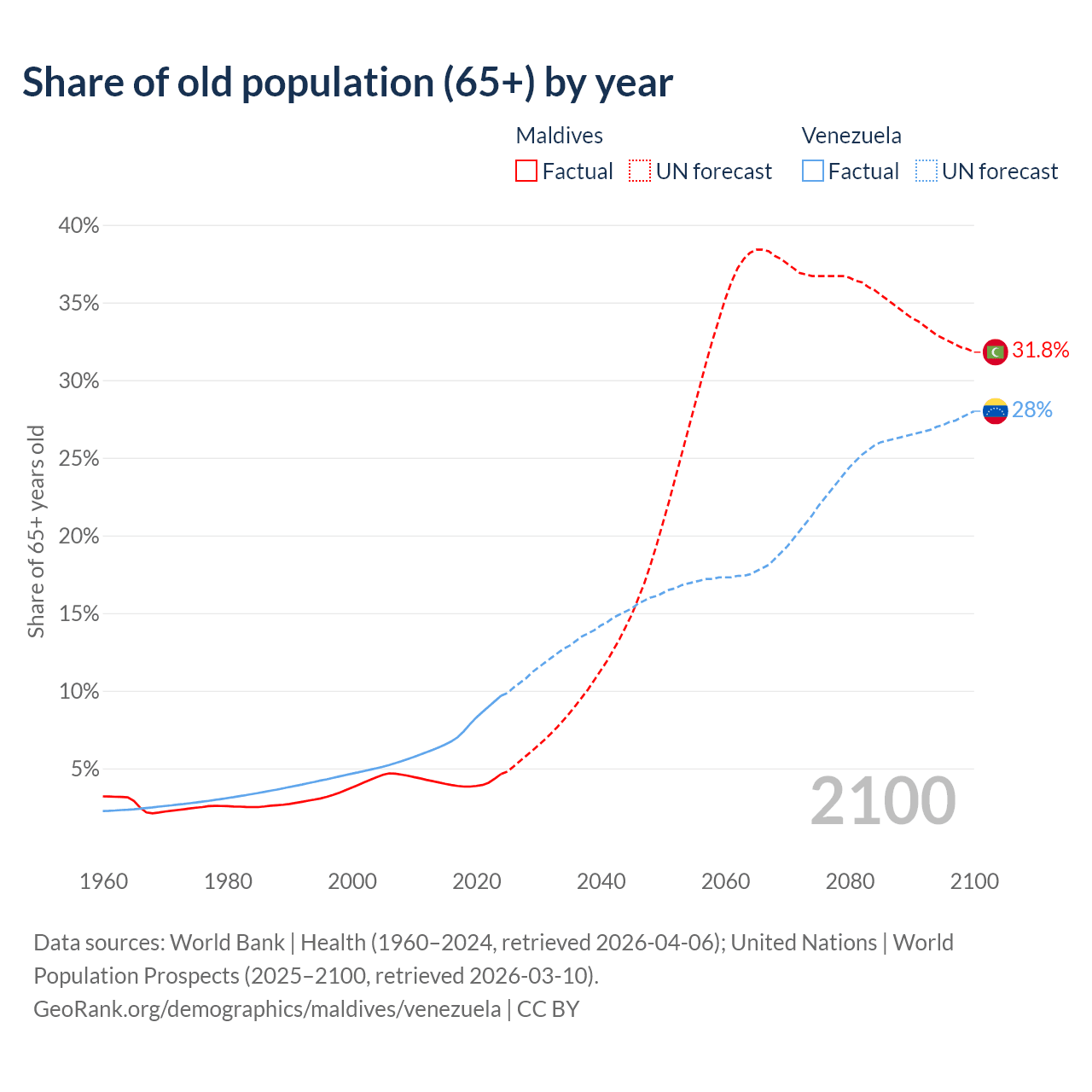 - The share of old-age demographic (65+) in Maldives is 4.64% vs 9.68% in Venezuela.