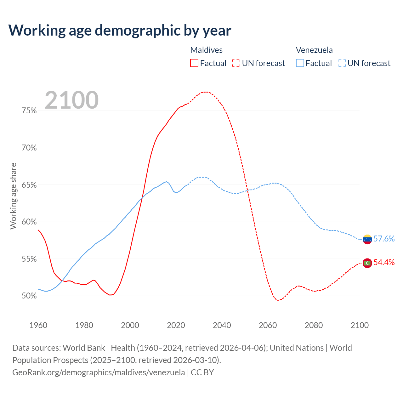 - Maldives has 403K working age adults (aged 15-64) vs 18.6M in Venezuela.