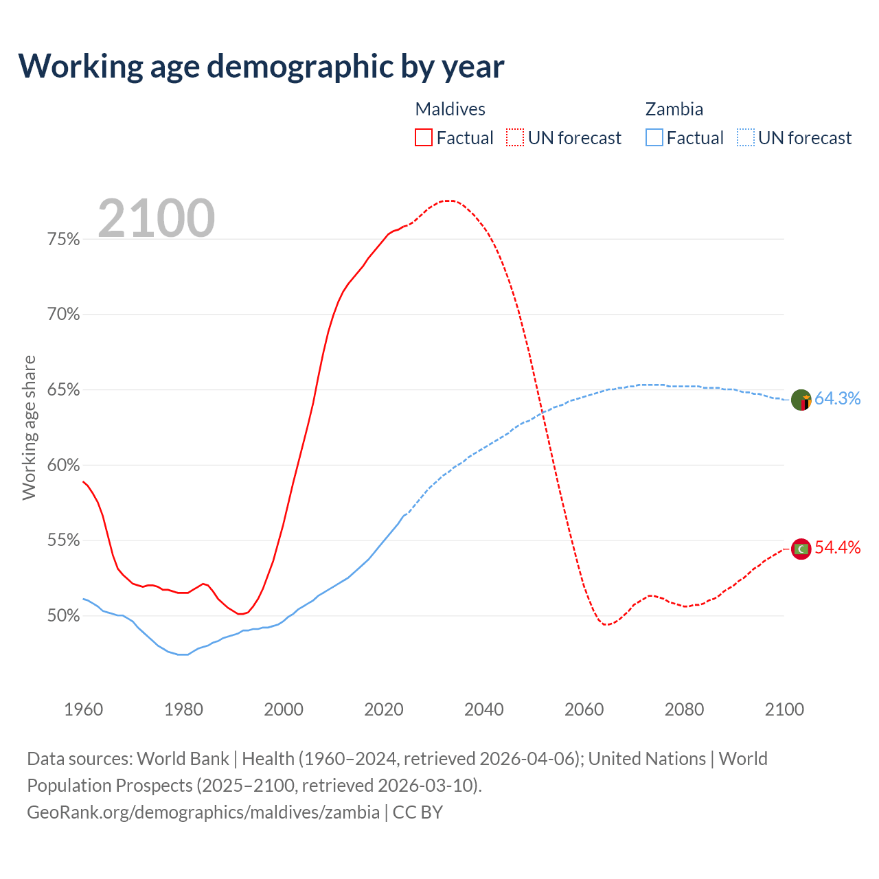 Median age Maldives vs Zambia, 1960-2100