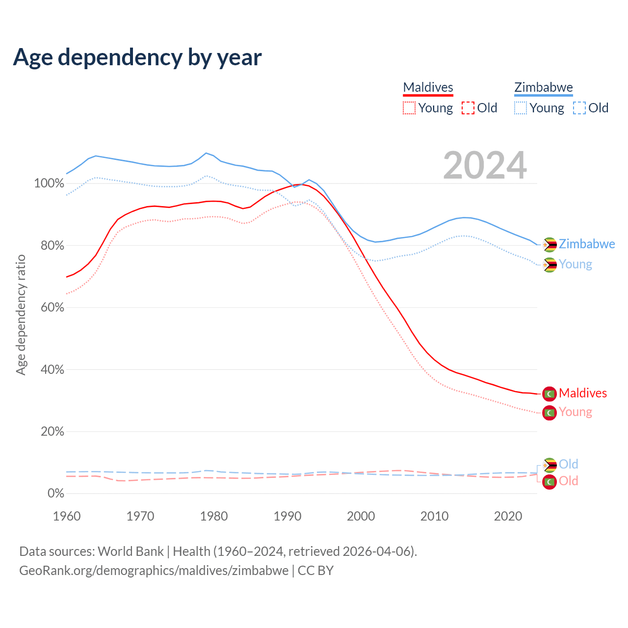 Data sources: World Bank | Health (1960–2024, retrieved 2026-04-06); U.S. Census Bureau (1960–2024, retrieved 2026-02-08).
