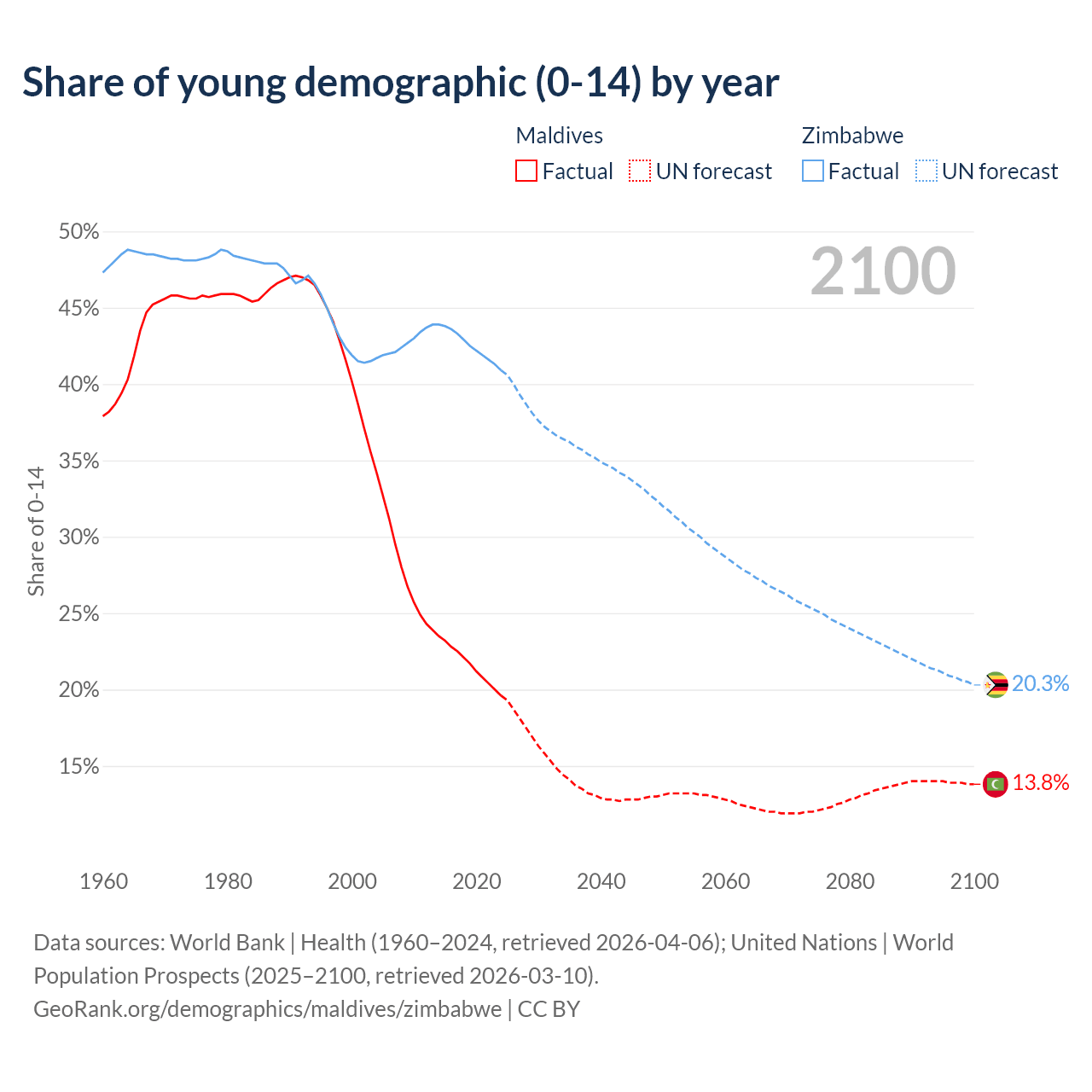 - The share of young demographic (0-15 years old) in Maldives is 19.6% vs 40.9% in Zimbabwe.