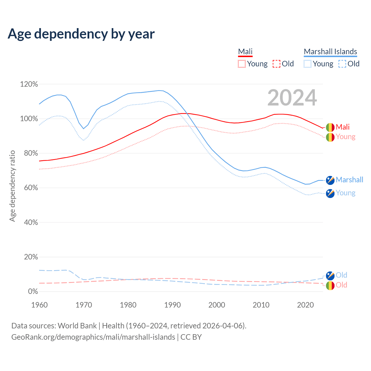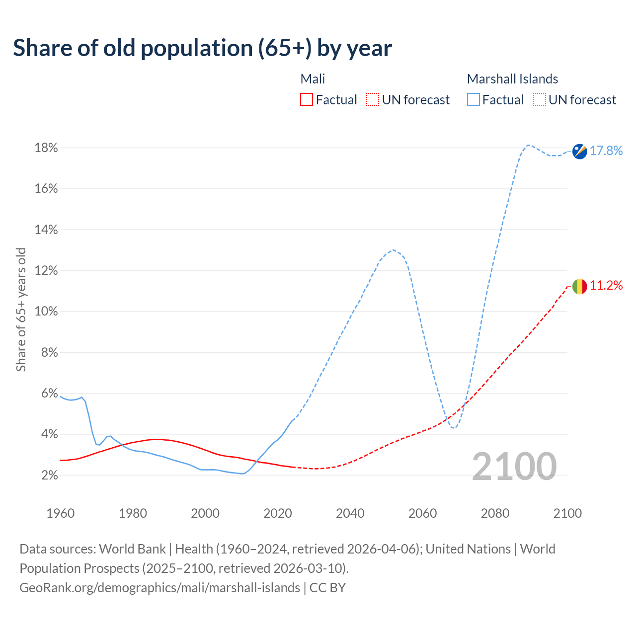 - The share of old-age demographic (65+) in Mali is 2.38% vs 4.64% in the Marshall Islands.