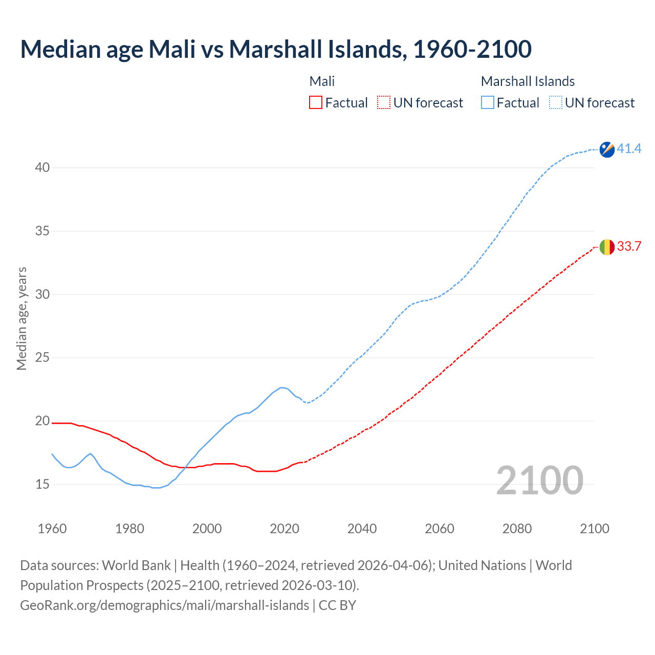 Median age Mali vs Marshall Islands, 1960-2100