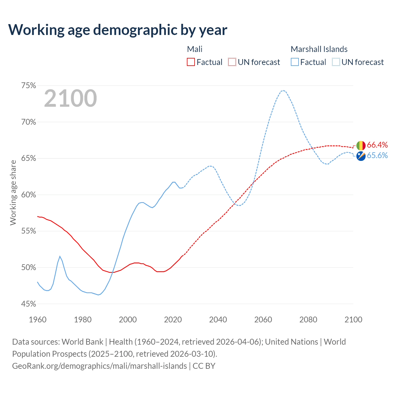 - Mali has 13.5M working age adults (aged 15-64) vs 21.3K in the Marshall Islands.