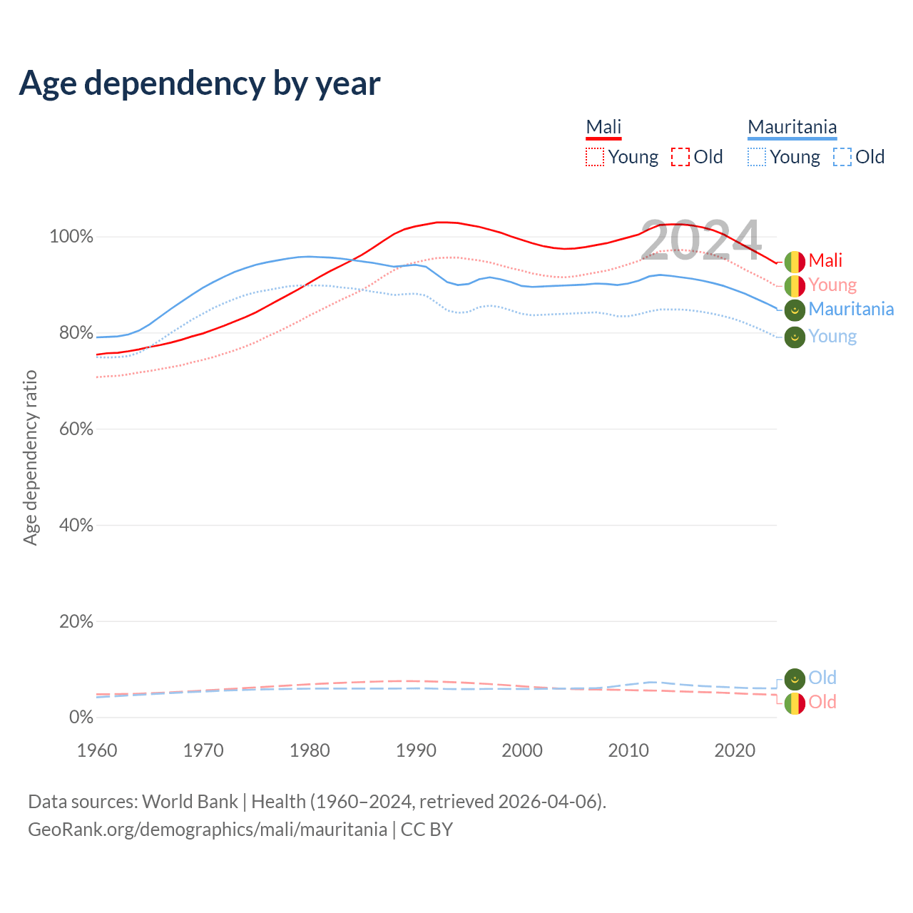 - Mali is ranked 193/196 by median age (oldest to youngest) vs 185/196 for Mauritania.