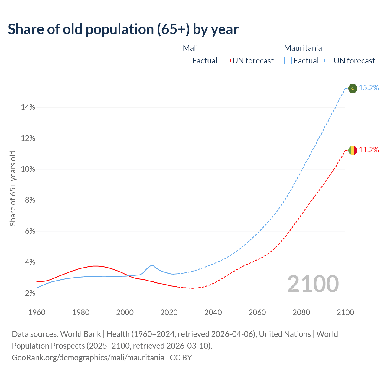 - The share of old-age demographic (65+) in Mali is 2.38% vs 3.23% in Mauritania.