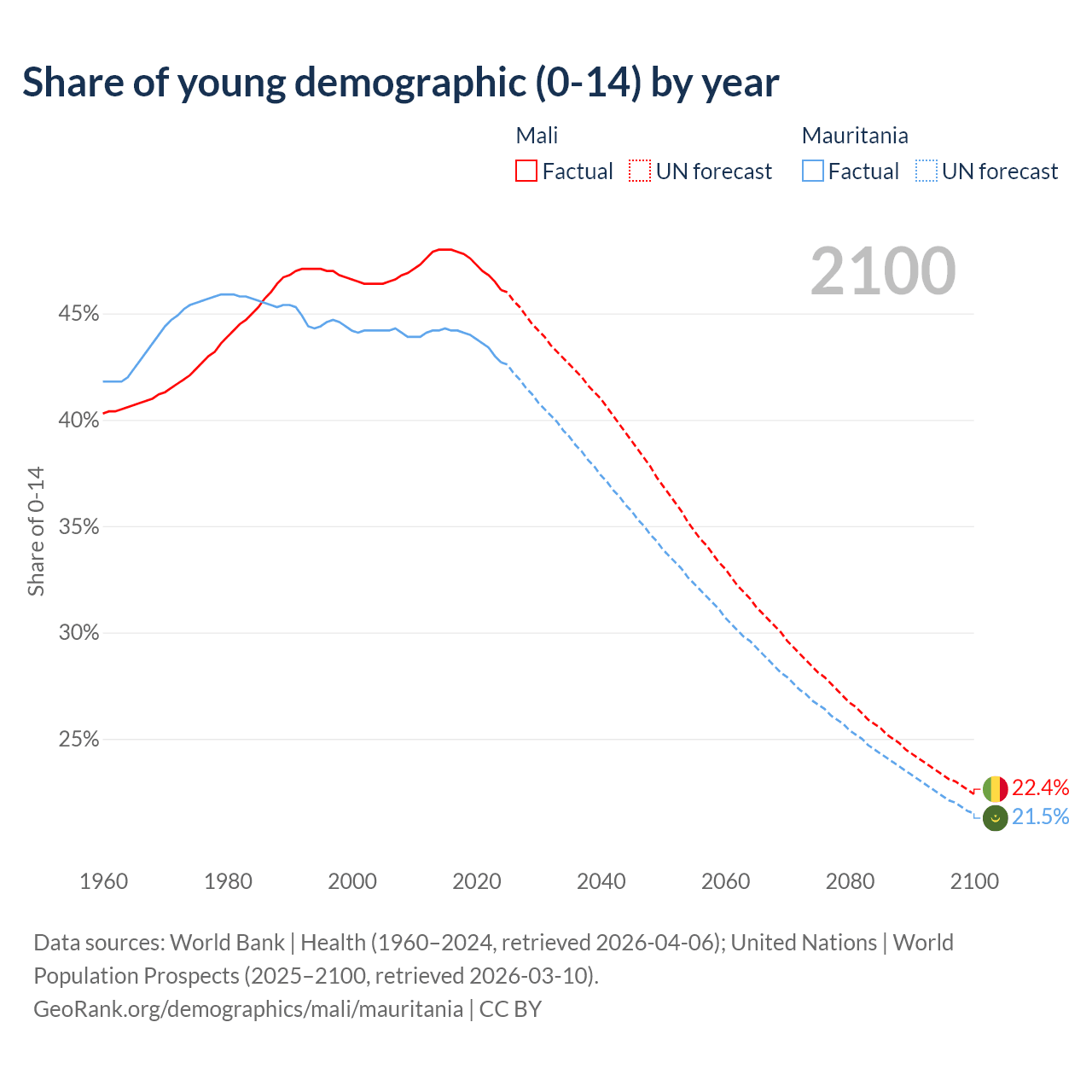 - The share of young demographic (0-15 years old) in Mali is 46.1% vs 42.7% in Mauritania.