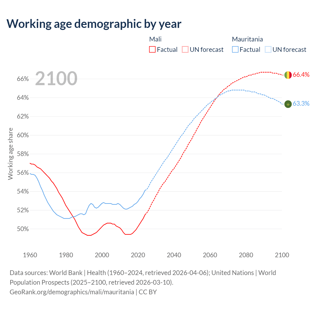 - Mali has 13.5M working age adults (aged 15-64) vs 2.98M in Mauritania.