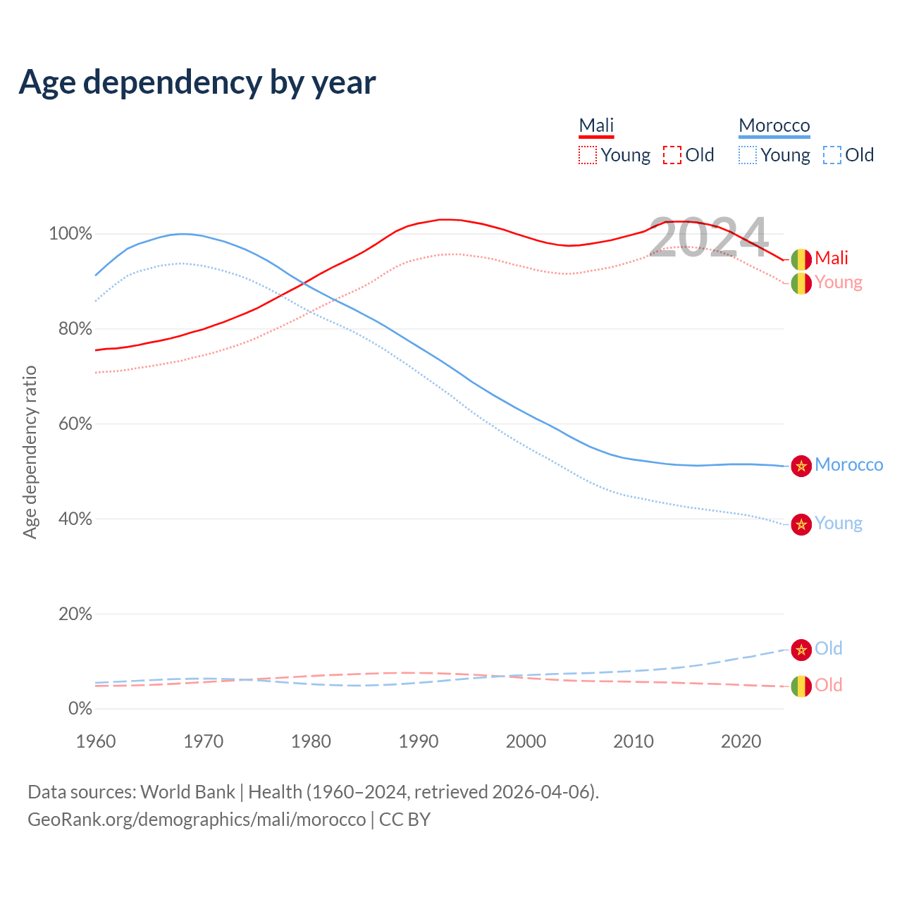 - Mali is ranked 193/196 by median age (oldest to youngest) vs 100/196 for Morocco.