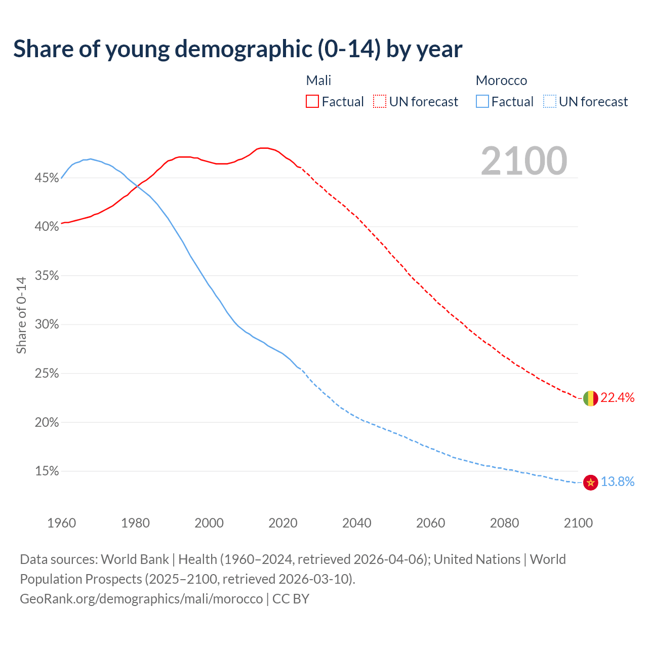 - The share of young demographic (0-15 years old) in Mali is 46.1% vs 25.6% in Morocco.