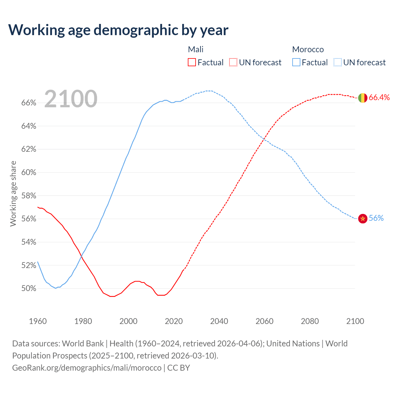 Median age Mali vs Morocco, 1960-2100