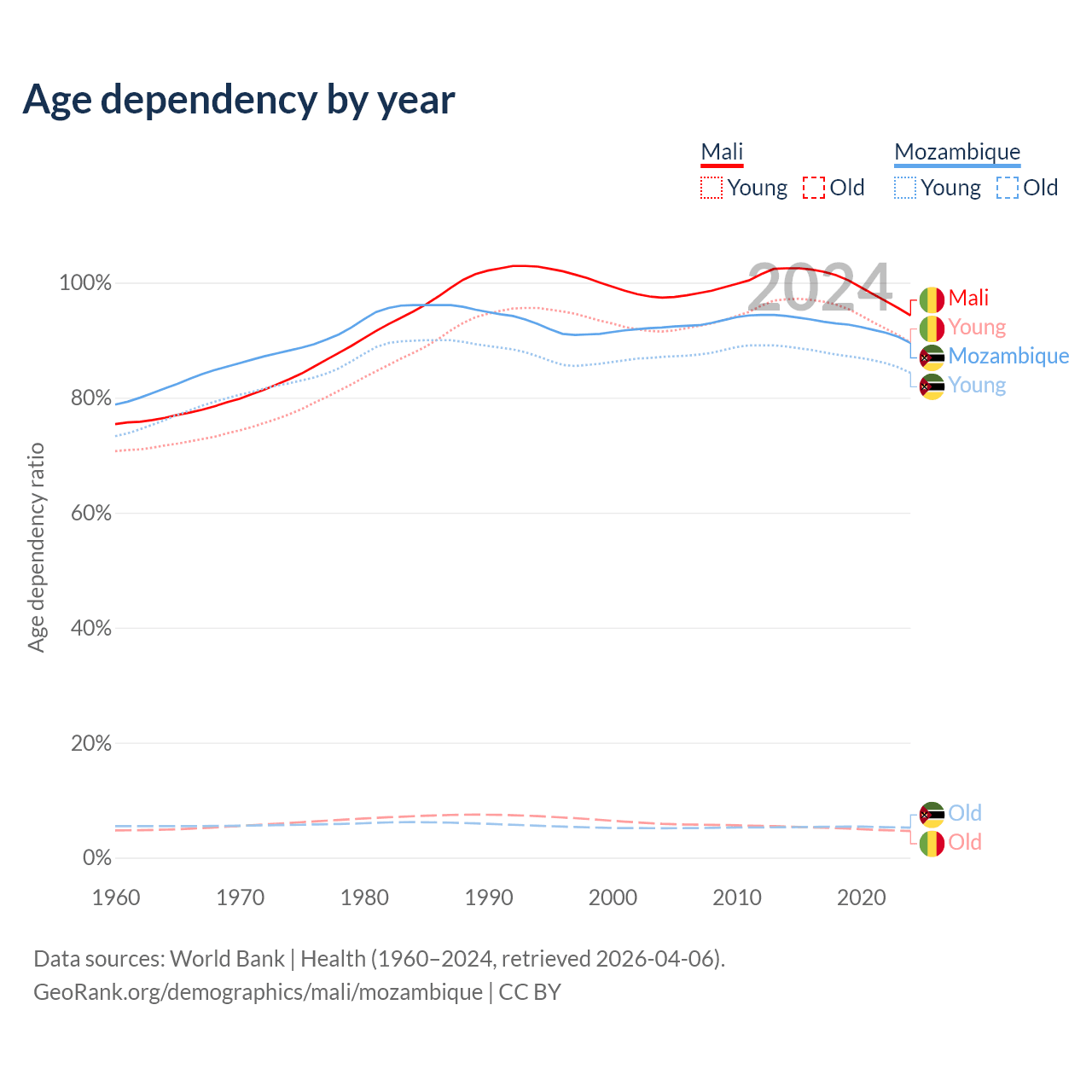 - Mali is ranked 193/196 by median age (oldest to youngest) vs 189/196 for Mozambique.
