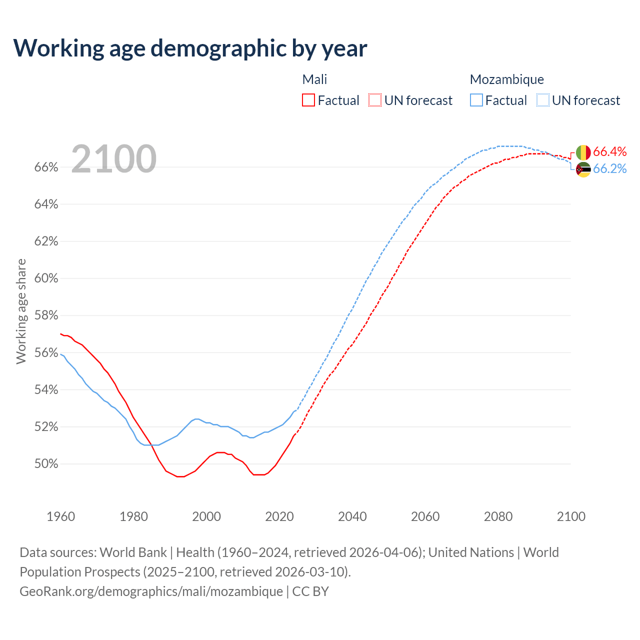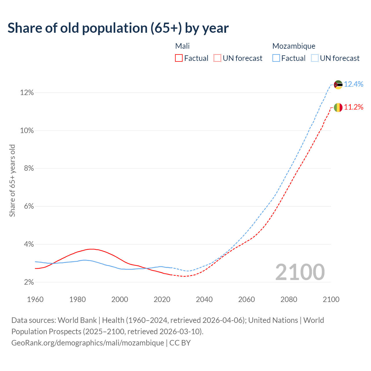 - The share of old-age demographic (65+) in Mali is 2.38% vs 2.75% in Mozambique.