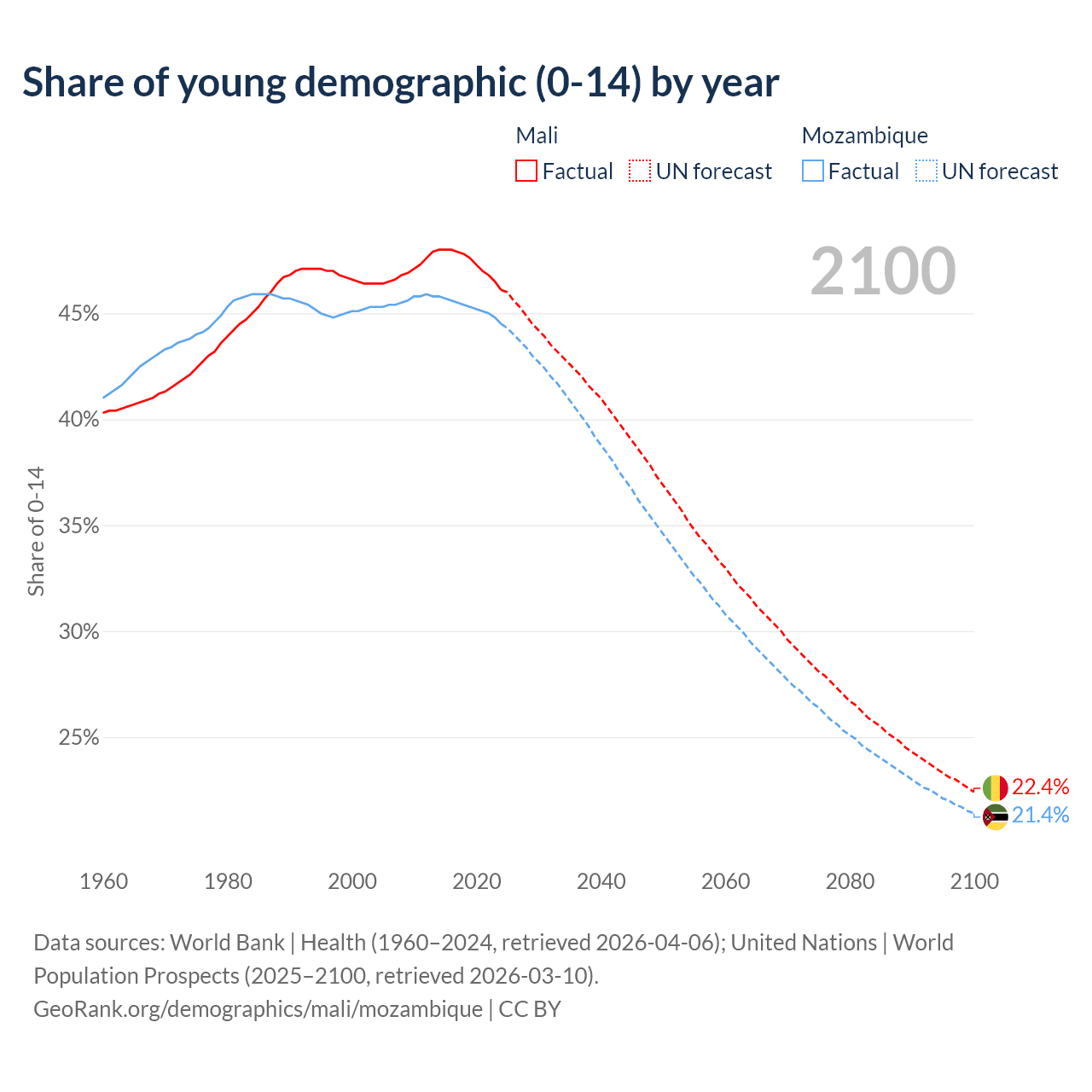 - The share of young demographic (0-15 years old) in Mali is 46.1% vs 44.5% in Mozambique.