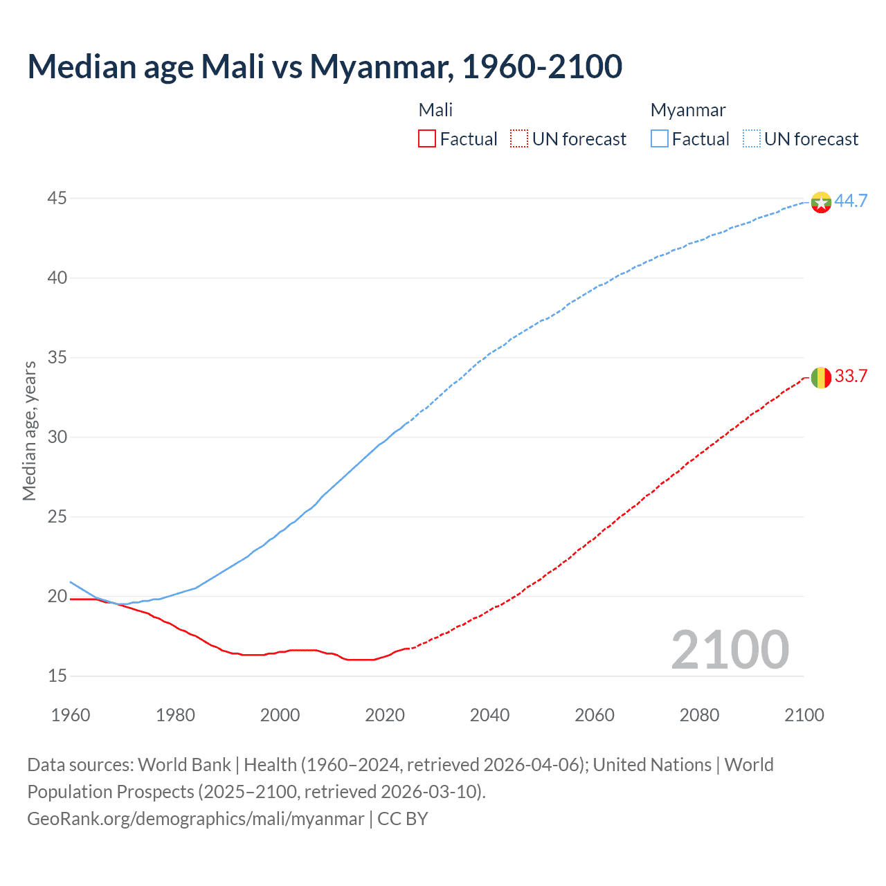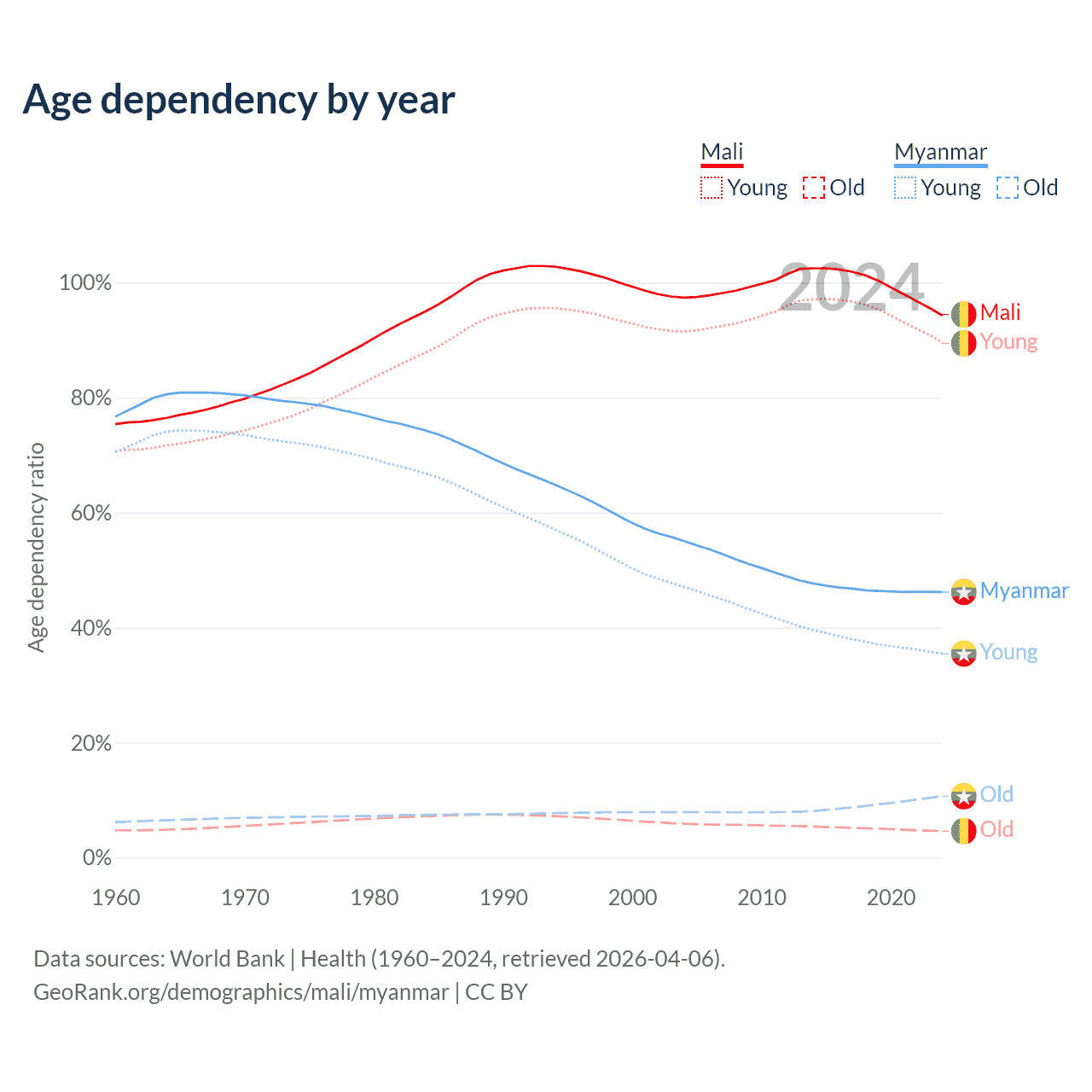 - Mali is ranked 193/196 by median age (oldest to youngest) vs 96/196 for Myanmar.