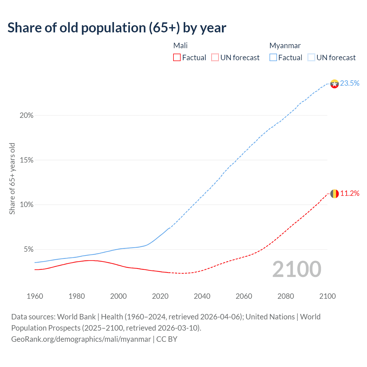 - The share of old-age demographic (65+) in Mali is 2.38% vs 7.3% in Myanmar.