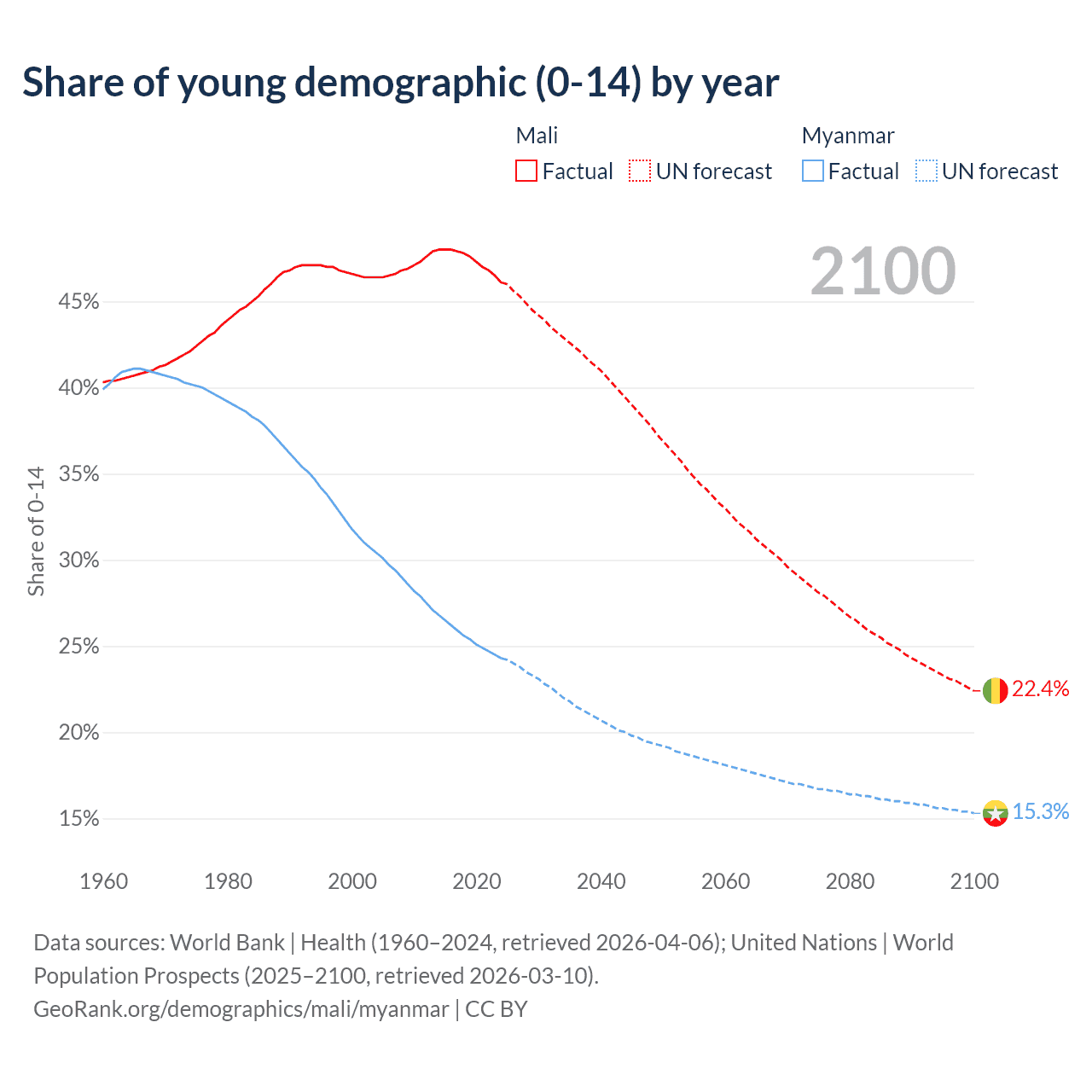 - The share of young demographic (0-15 years old) in Mali is 46.1% vs 24.3% in Myanmar.