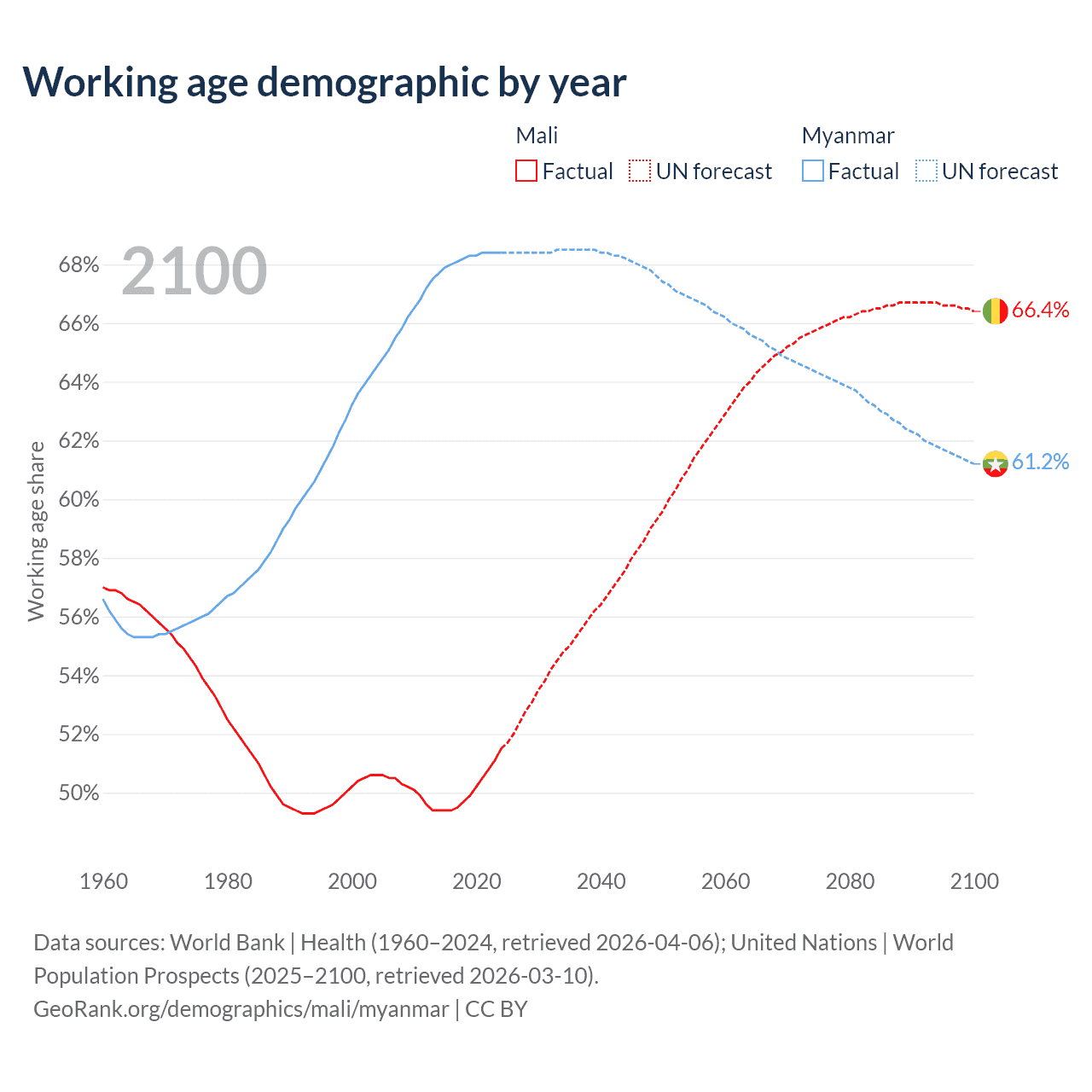 - Mali has 13.5M working age adults (aged 15-64) vs 37.8M in Myanmar.