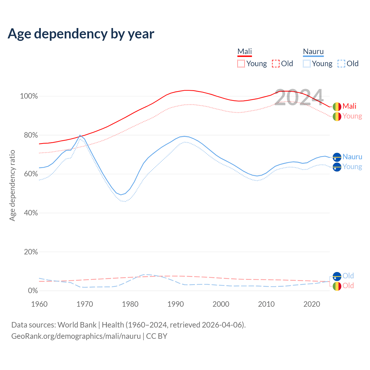 - Mali is ranked 193/196 by median age (oldest to youngest) vs 155/196 for Nauru.