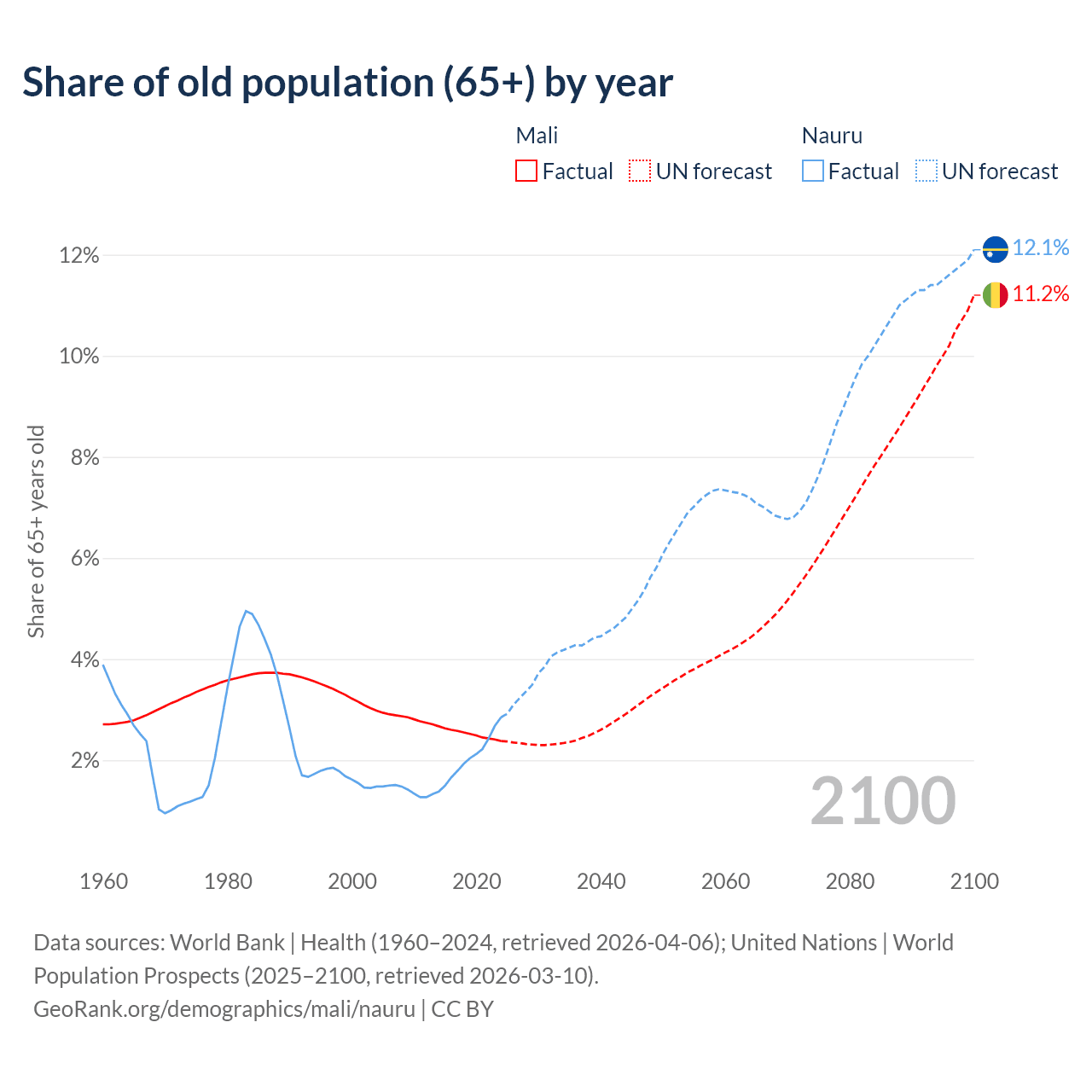 - The share of old-age demographic (65+) in Mali is 2.38% vs 2.85% in Nauru.