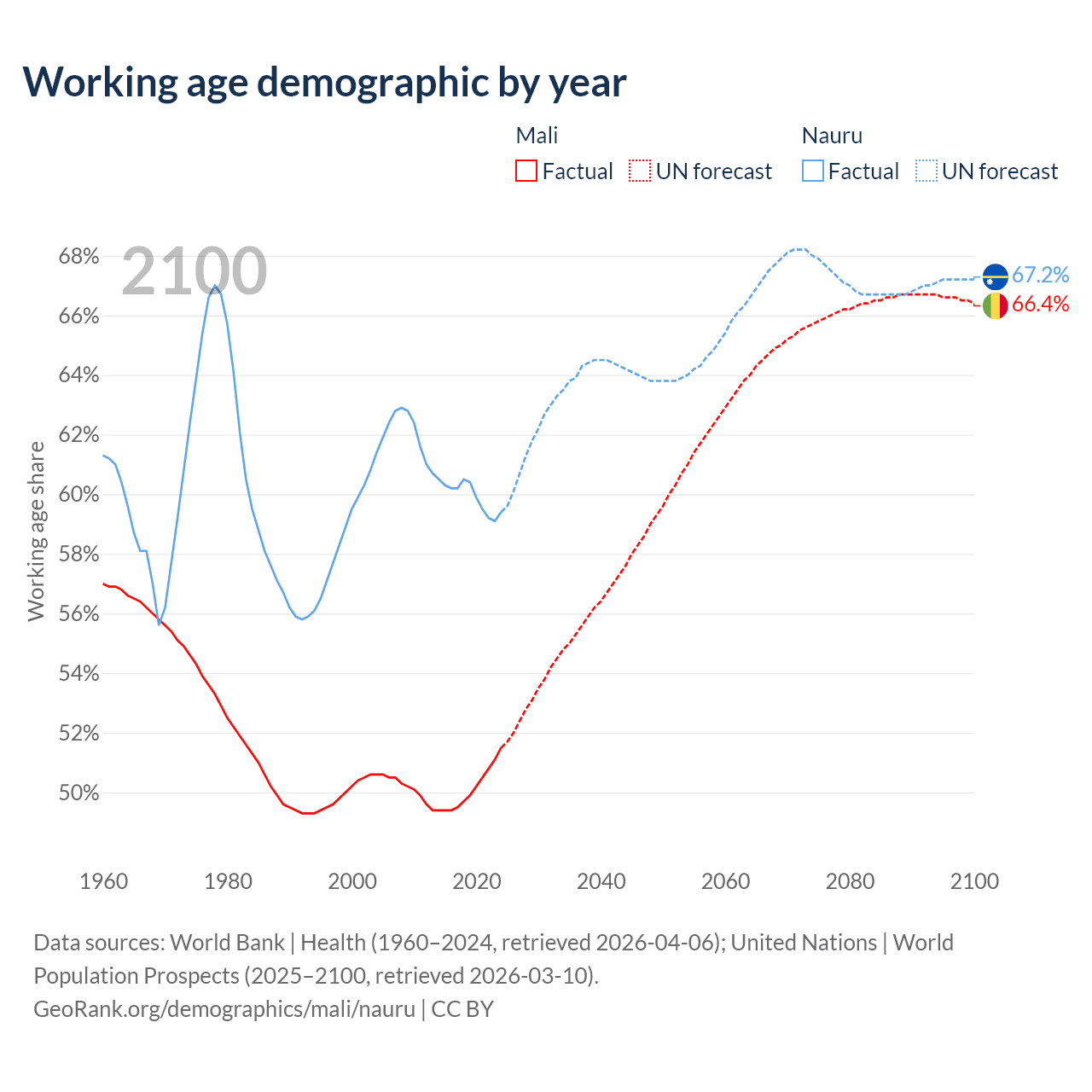 - Mali has 13.5M working age adults (aged 15-64) vs 7.2K in Nauru.