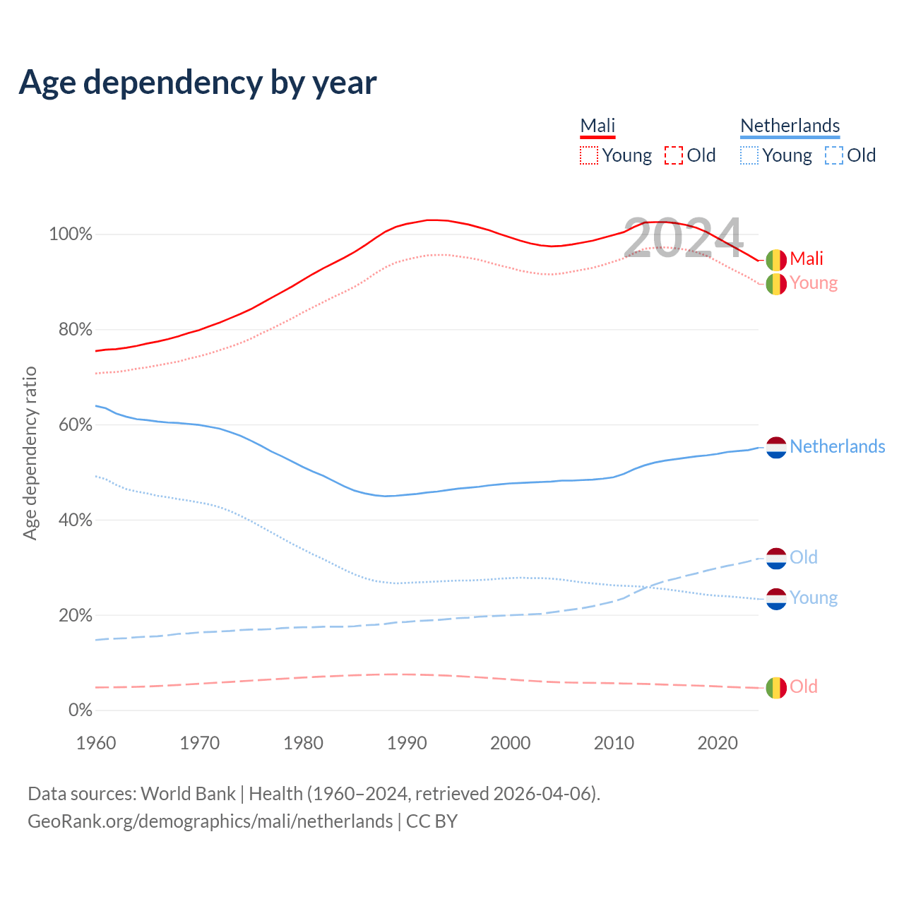 - The share of old-age demographic (65+) in Mali is 2.38% vs 20.5% in the Netherlands.