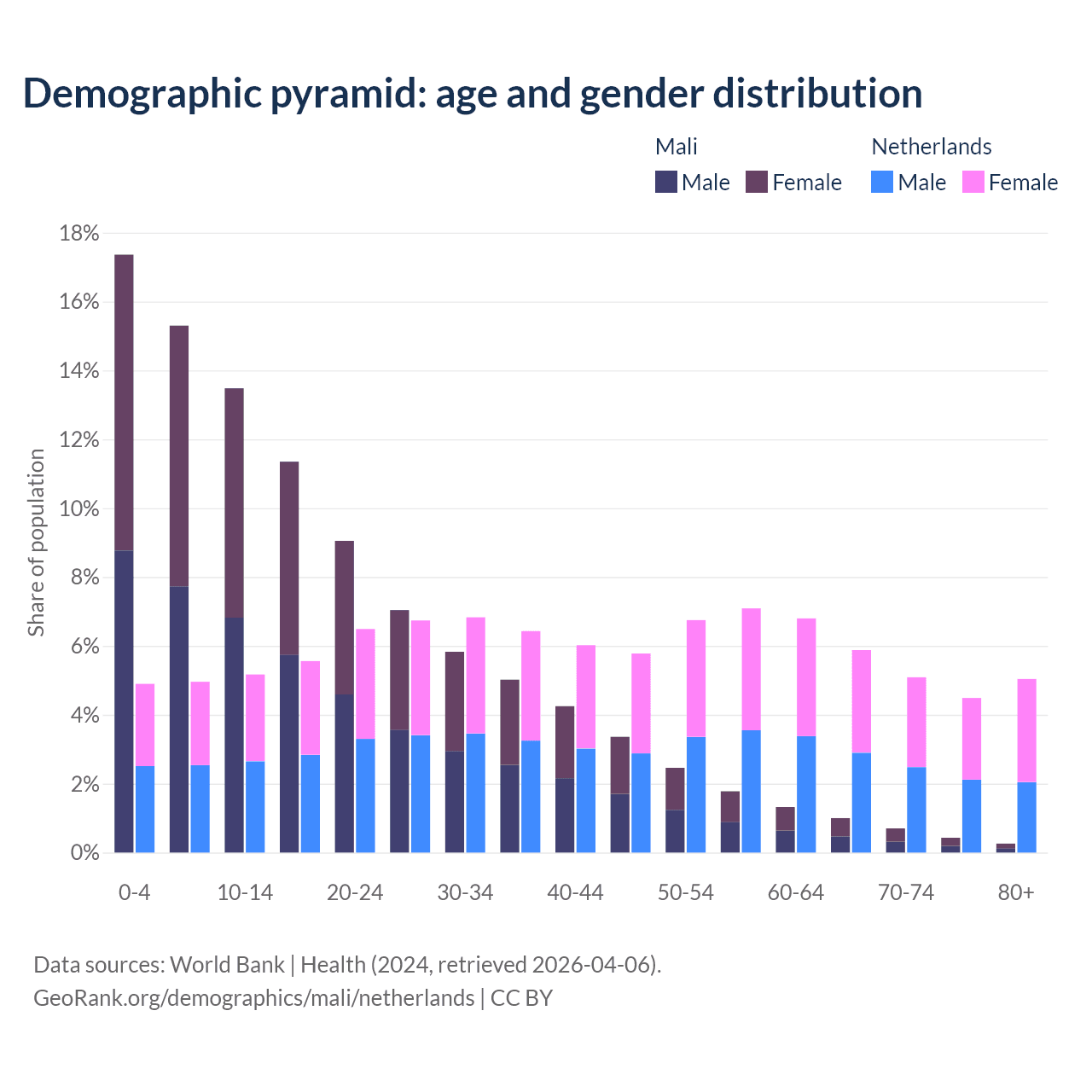 - Mali is ranked 193/196 by median age (oldest to youngest) vs 33/196 for the Netherlands.