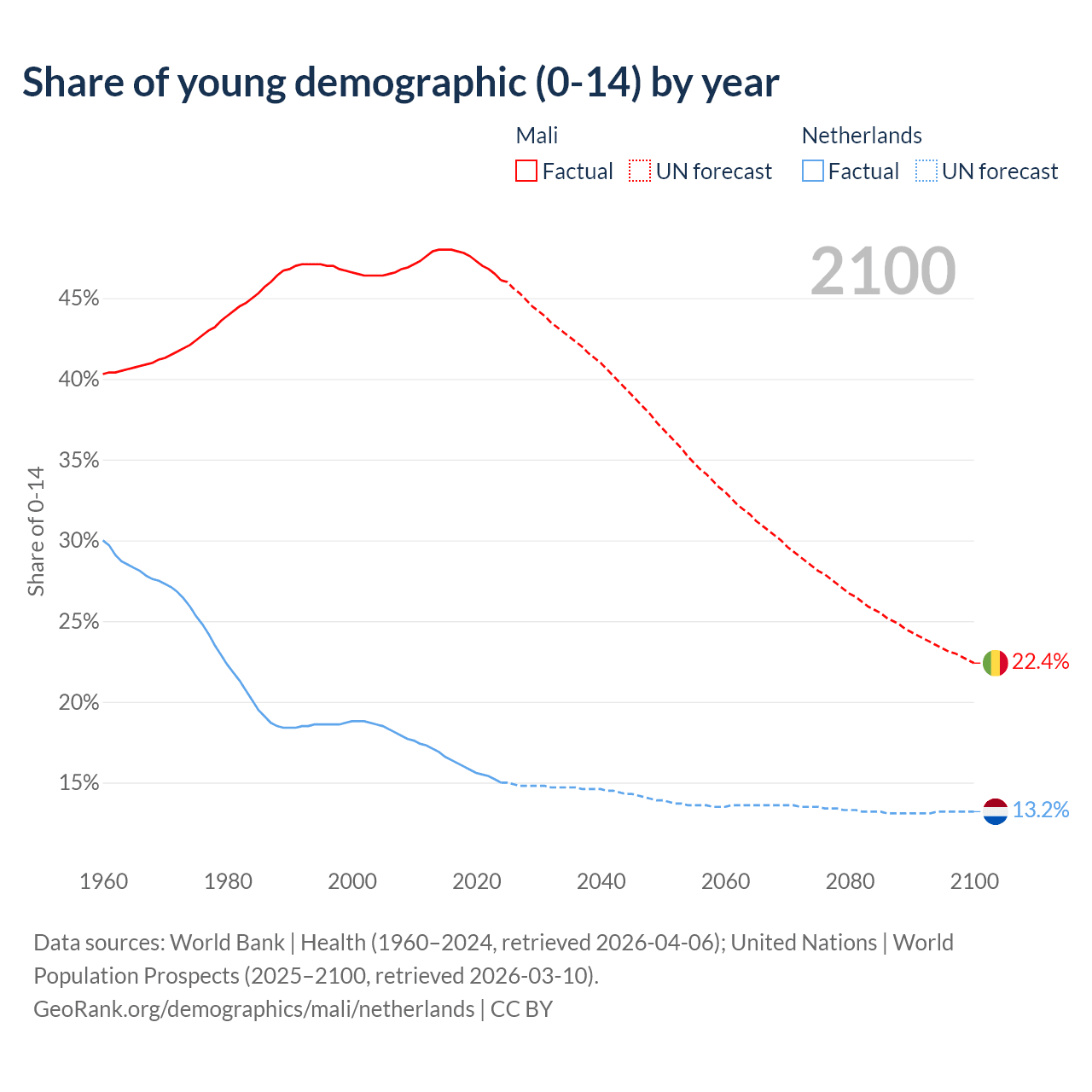 - The share of young demographic (0-15 years old) in Mali is 46.1% vs 15% in the Netherlands.