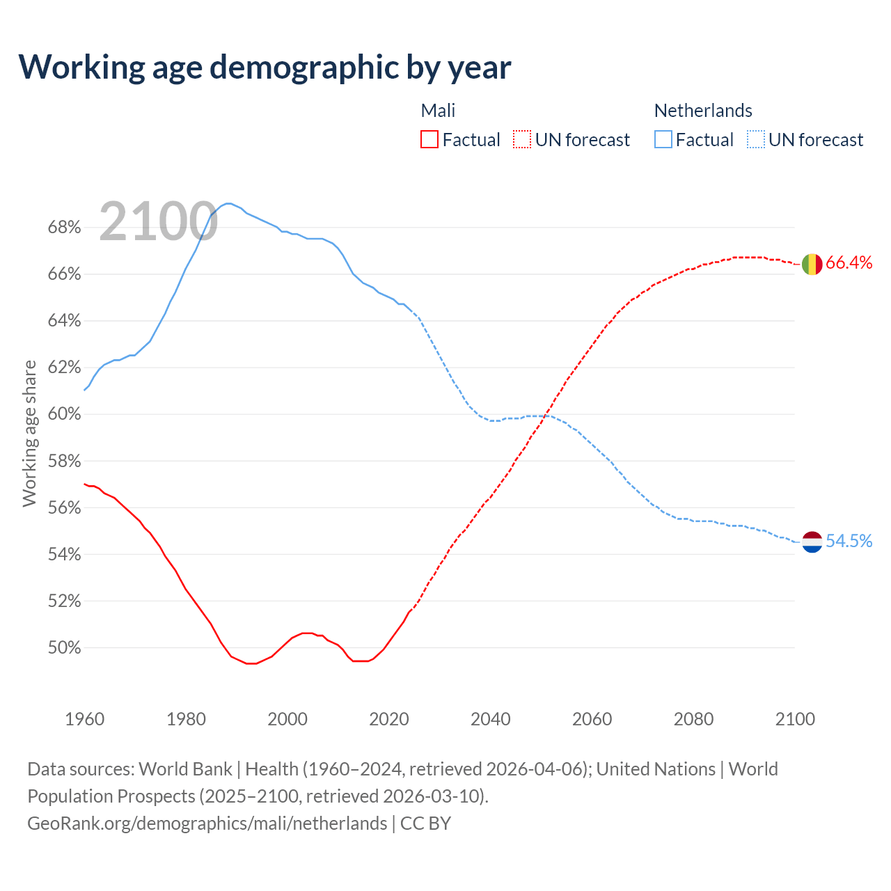 - Mali has 13.5M working age adults (aged 15-64) vs 11.8M in the Netherlands.