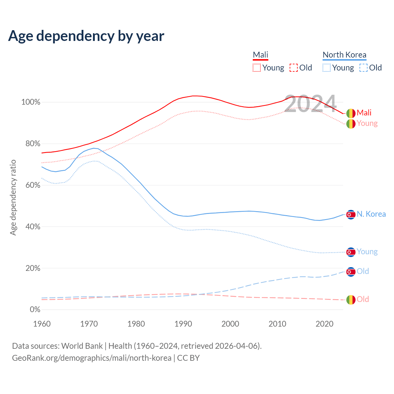 - Mali is ranked 193/196 by median age (oldest to youngest) vs 62/196 for North Korea.