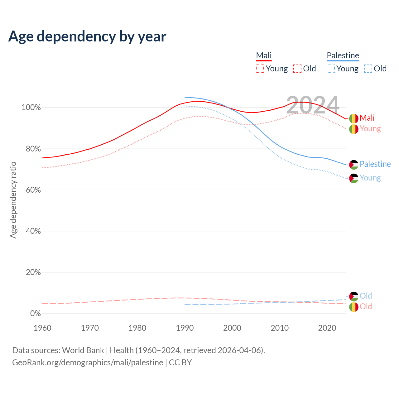 - Mali is ranked 193/196 by median age (oldest to youngest) vs 157/196 for Palestine.