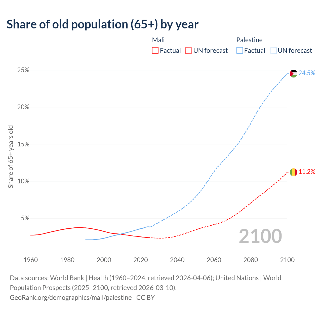 - The share of old-age demographic (65+) in Mali is 2.38% vs 3.84% in Palestine.