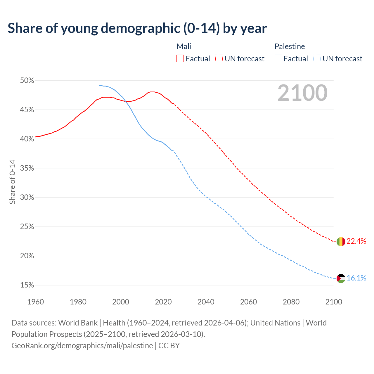 - The share of young demographic (0-15 years old) in Mali is 46.1% vs 38% in Palestine.