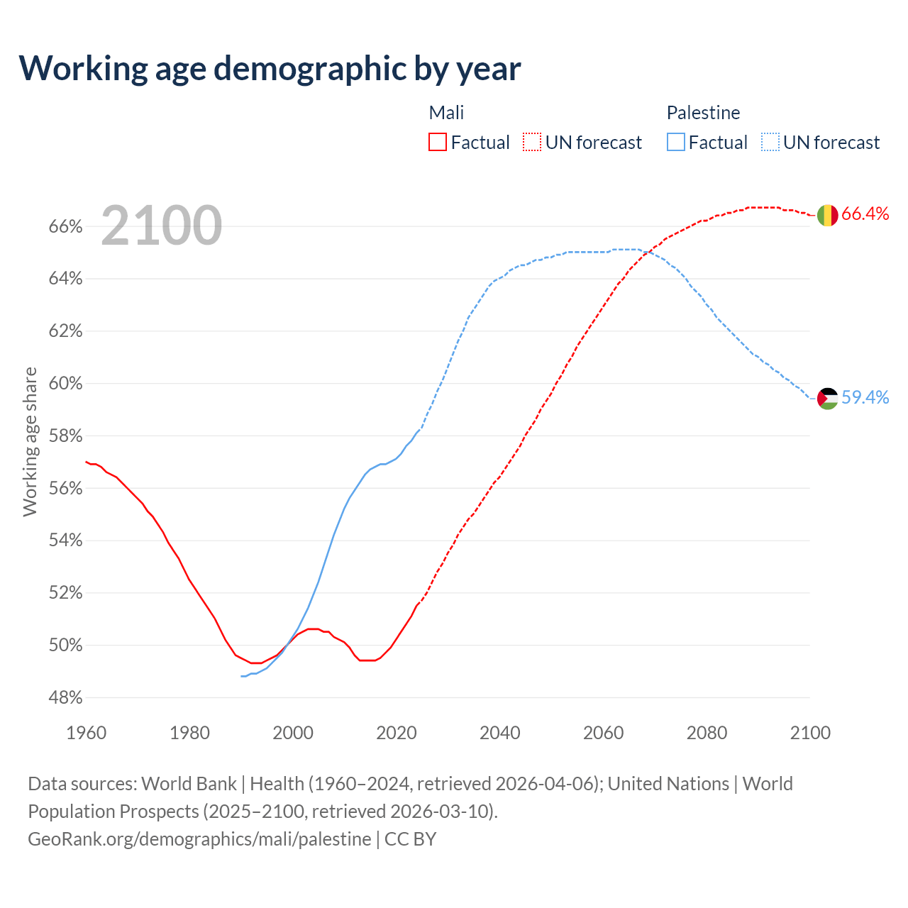 - Mali has 13.5M working age adults (aged 15-64) vs 3.2M in Palestine.