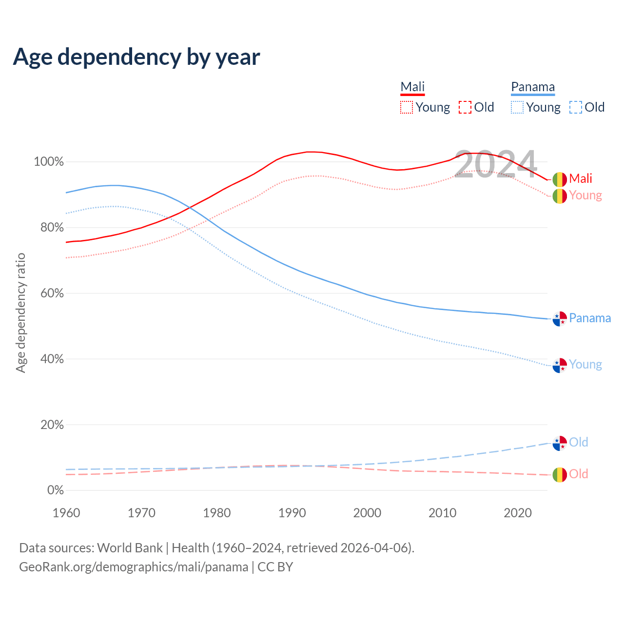 - Mali is ranked 193/196 by median age (oldest to youngest) vs 94/196 for Panama.