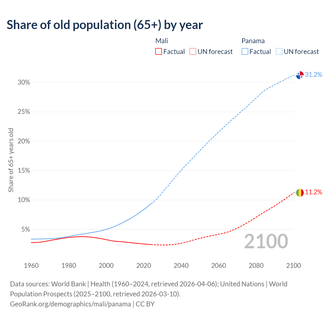 - The share of old-age demographic (65+) in Mali is 2.38% vs 9.35% in Panama.