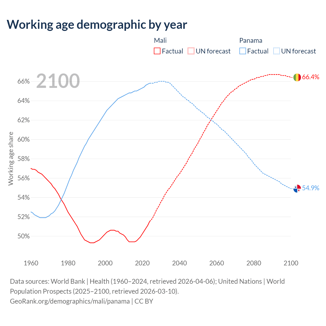 - Mali has 13.5M working age adults (aged 15-64) vs 3.05M in Panama.