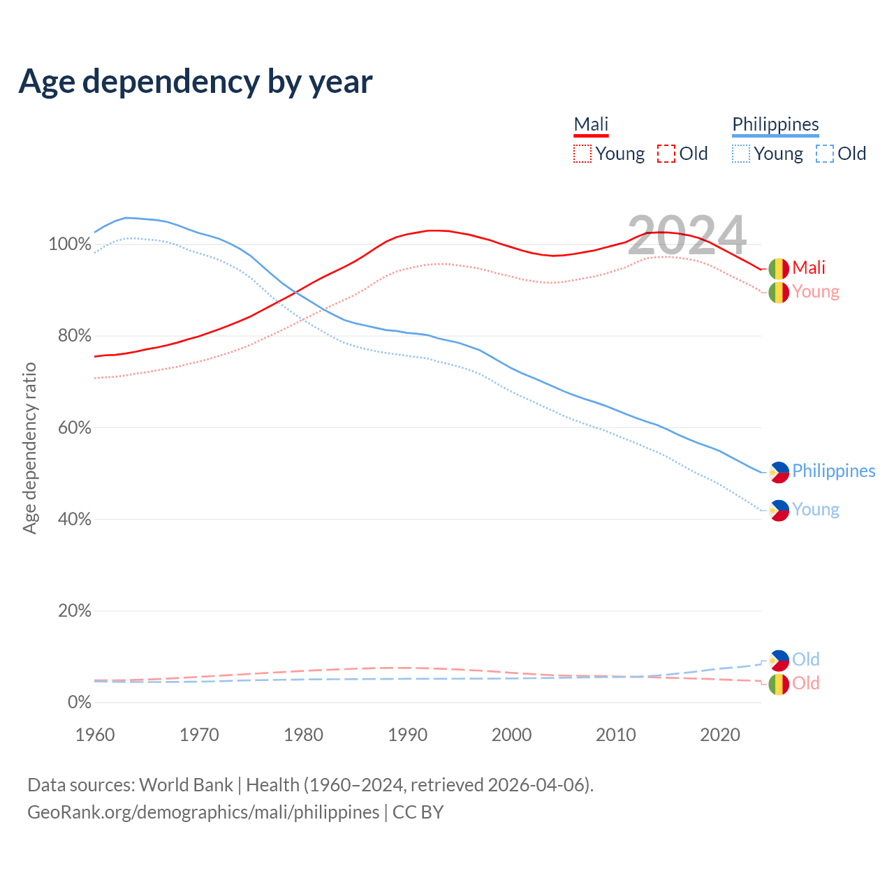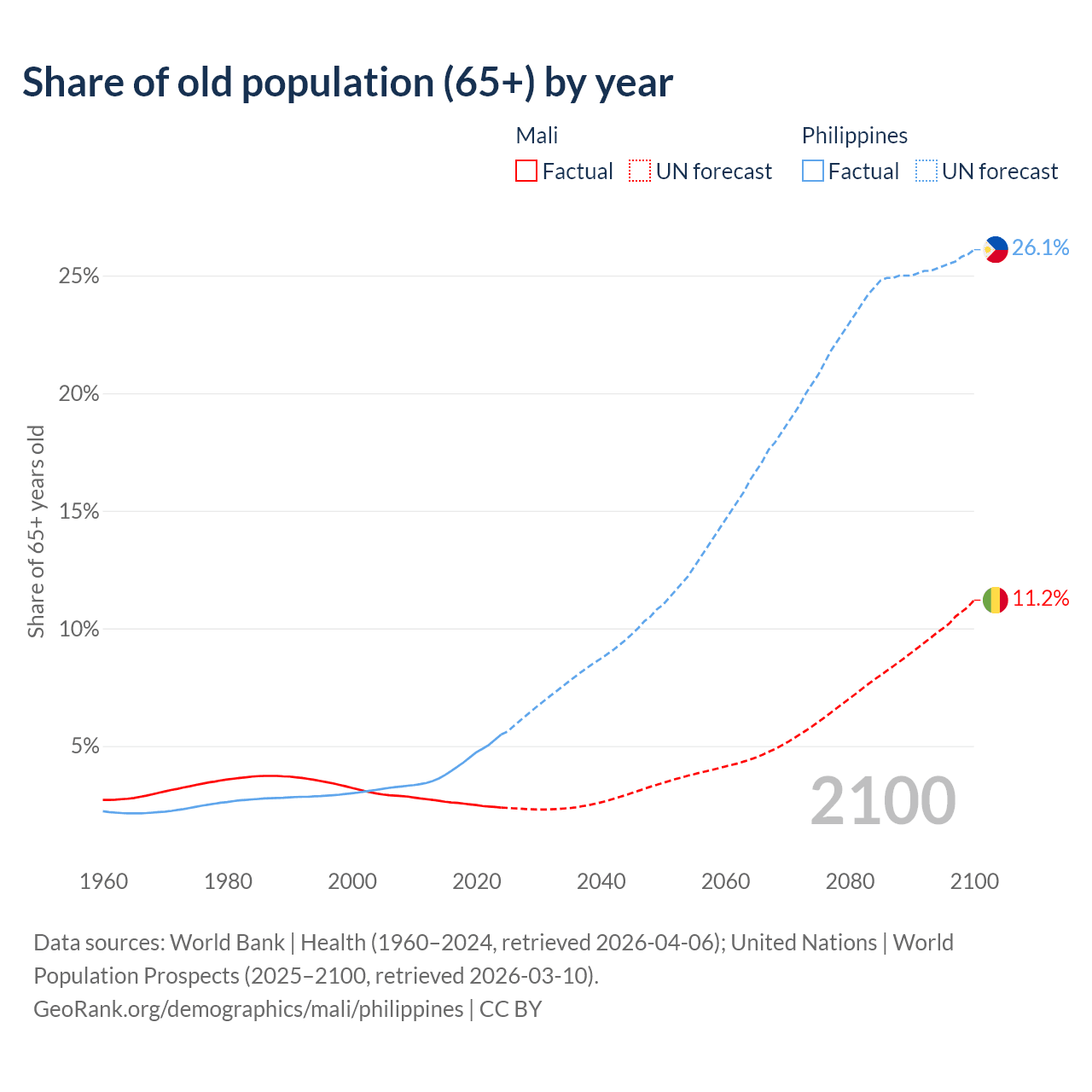 - The share of old-age demographic (65+) in Mali is 2.38% vs 5.49% in the Philippines.