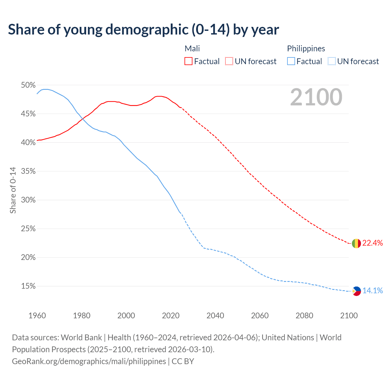 - The share of young demographic (0-15 years old) in Mali is 46.1% vs 27.9% in the Philippines.