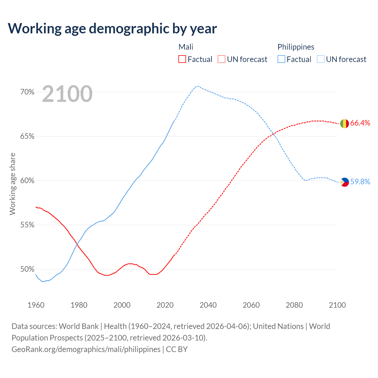 - Mali has 13.5M working age adults (aged 15-64) vs 78.6M in the Philippines.