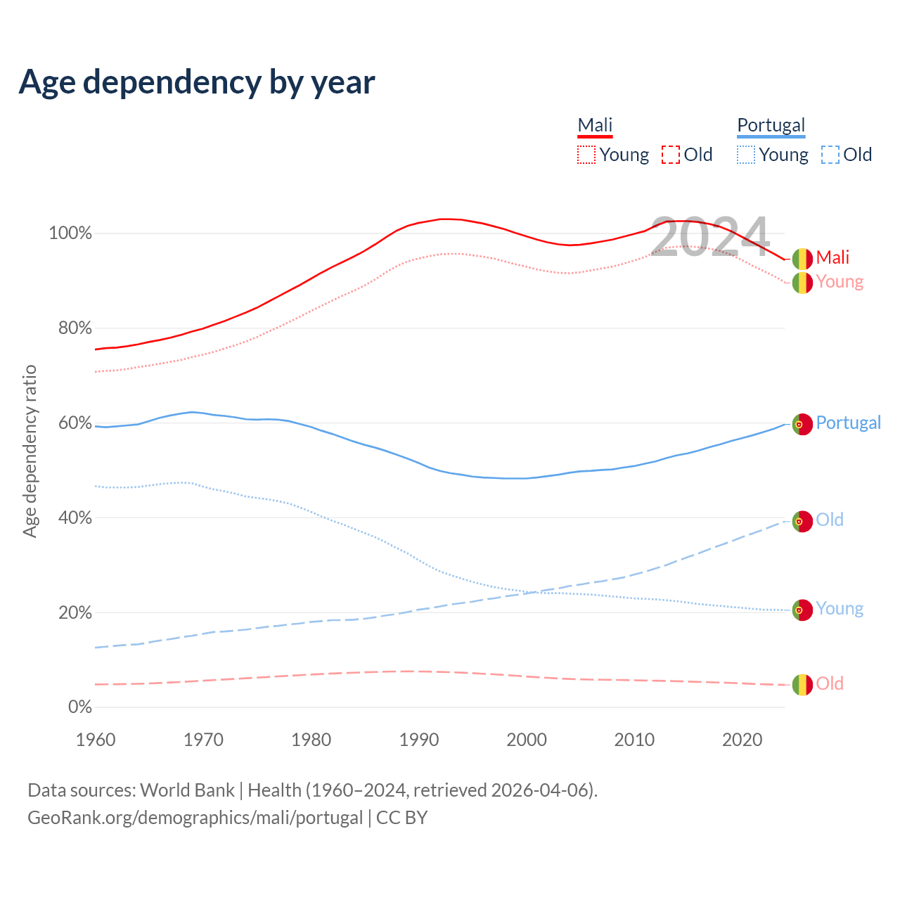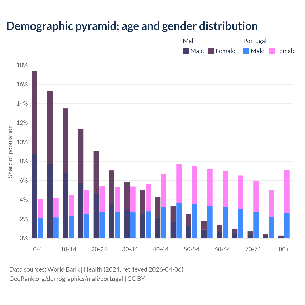 - Mali is ranked 193/196 by median age (oldest to youngest) vs 5/196 for Portugal.