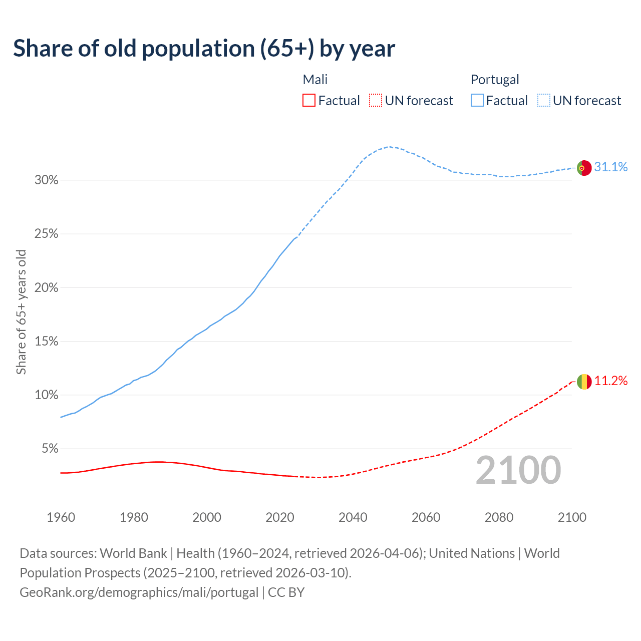 - The share of old-age demographic (65+) in Mali is 2.38% vs 24.5% in Portugal.